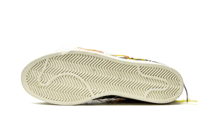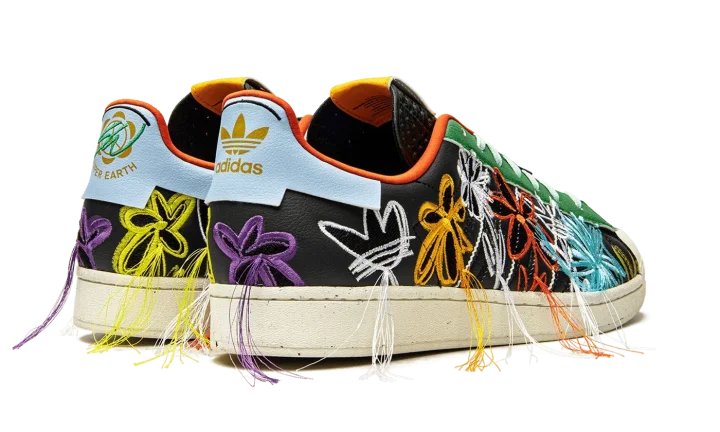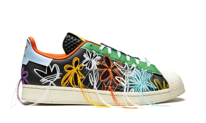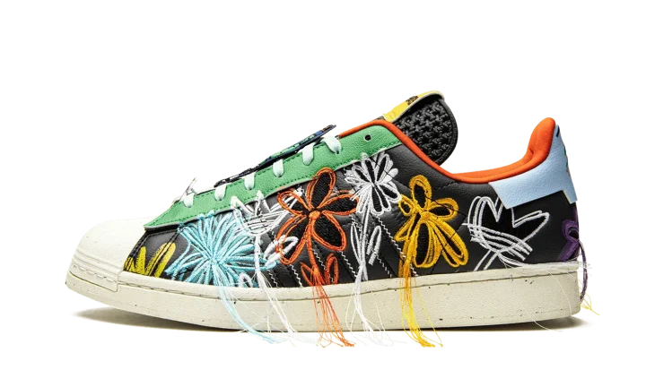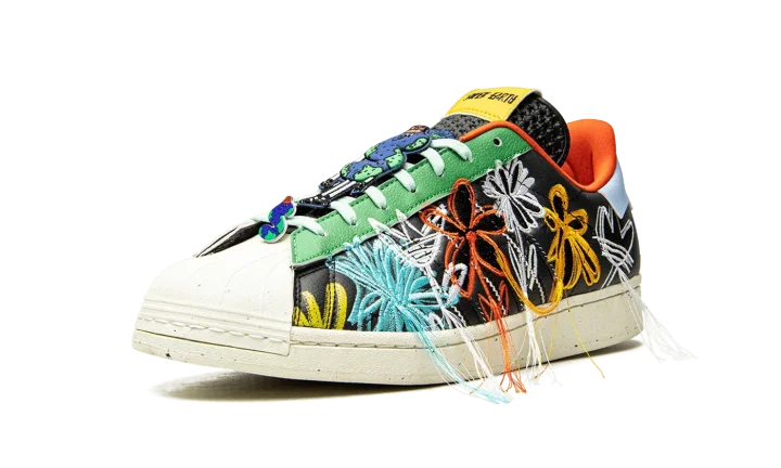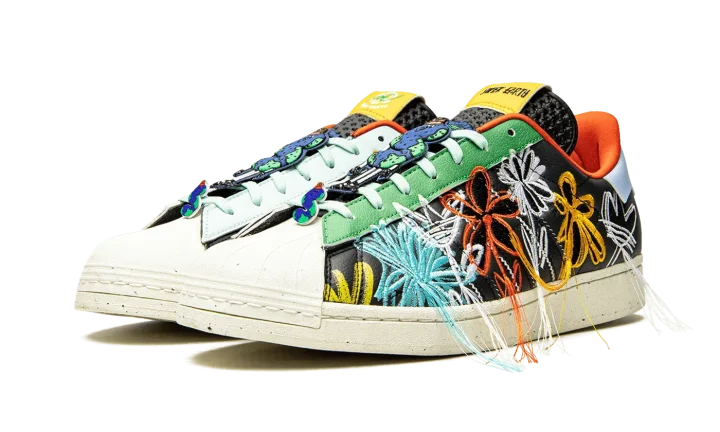 The Superstar 'Sean Wotherspoon - Superearth' shoe features a unique design by Sean Wotherspoon, incorporating sustainable materials and vibrant colors for a distinctive and eco-conscious take on the classic Superstar.
