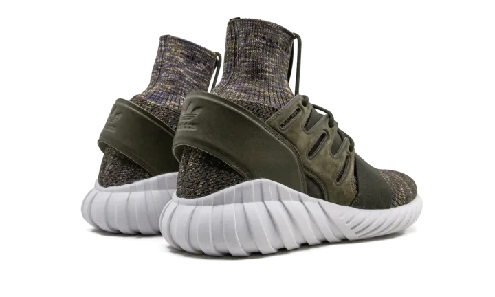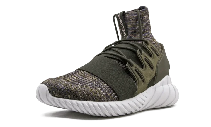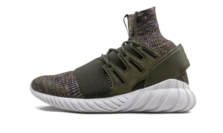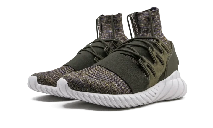 The Adidas Tubular Doom Primeknit takes on an earthy color palette while showing off an avant garde construction. This unique sneaker is created from a sock-like base made of a brown, tan, blue, and dark red color mixture. An olive green elastic strap, suede guard, and leather cage keep the foot in place. Adding sleek characteristics are the smooth white outsole and subtle Nike branding that runs down the tongue of the model.