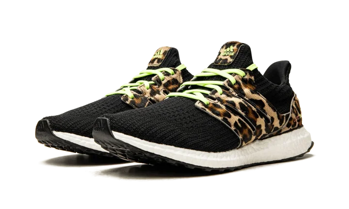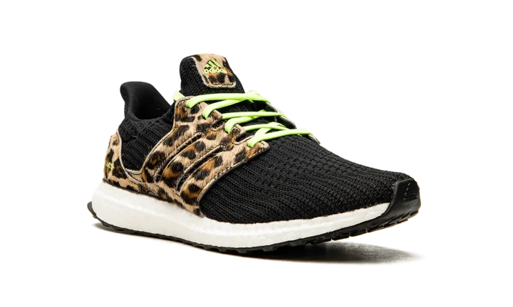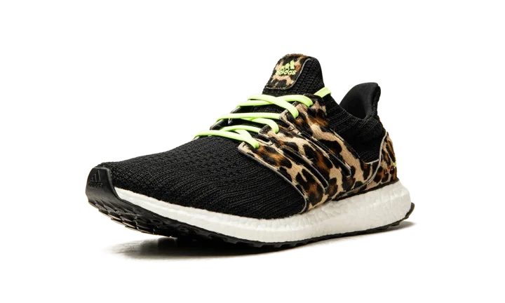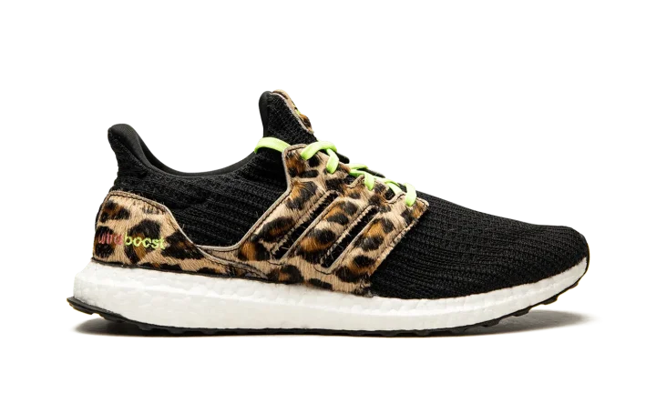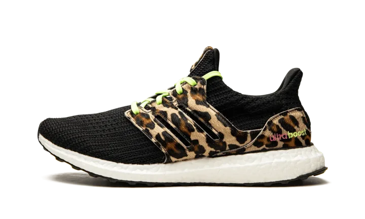 The adidas Ultra Boost "Animal Pack - Leopard" is a creative look for the performance running and lifestyle shoe by adidas that features exotic leopard print on its design. Released in December 2020, the "Leopard" Ultra Boost is one of the model's more adventurous colorways as it combines a black woven Primeknit upper with faux leopard print on the Three Stripes lacing "cage," molded heel cup, and tongue tag. Additional eye-catching details include neon green laces and "adidas" branding on the tongue, and pink and neon green "Ultra Boost" detailing on the lateral side of the heel counter. The shoe rides on a white Boost cushioned midsole protected by a Continental Rubber outsole.