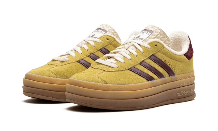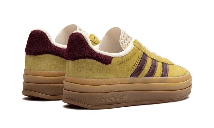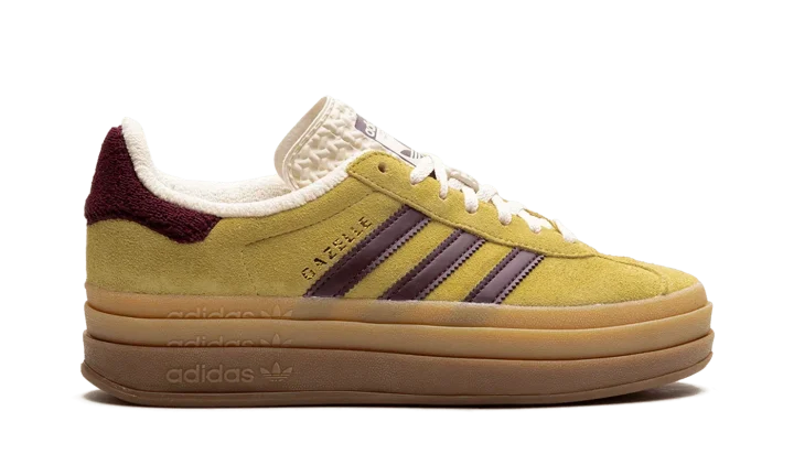 The Women's adidas Gazelle Bold "Yellow/Burgundy" is a women's-exclusive colorway of the retro shoe with a platform-style sole and other modifications. The contemporary-looking adidas Gazelle Bold features a triple-stacked, raised sole. As for the rest of the design, the shoe features a mustard yellow suede upper with burgundy leather Three Stripes on the sides. Gold "Gazelle" branding is seen on the lateral side of the shoe. The burgundy terry cloth heel tab matches the material used on the shoe's inner lining. A stacked gum rubber sole completes the look.