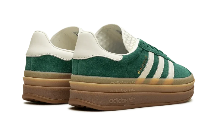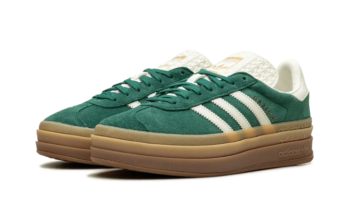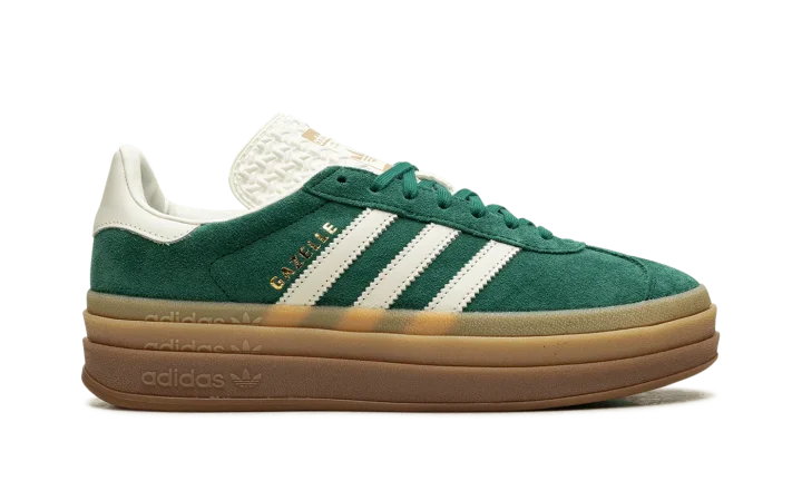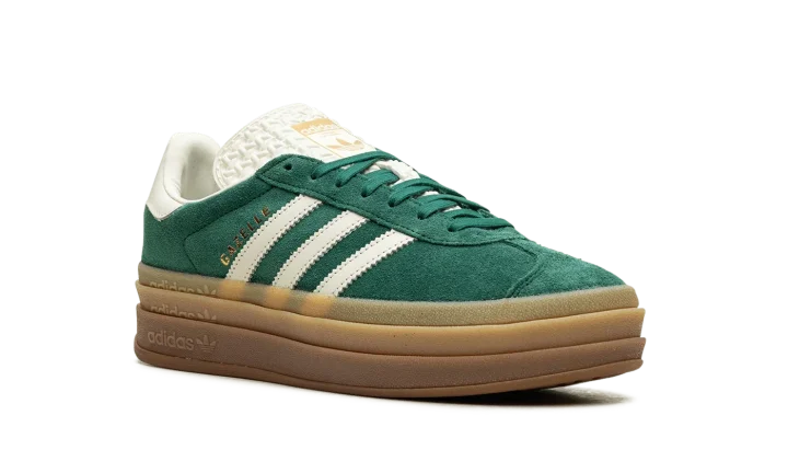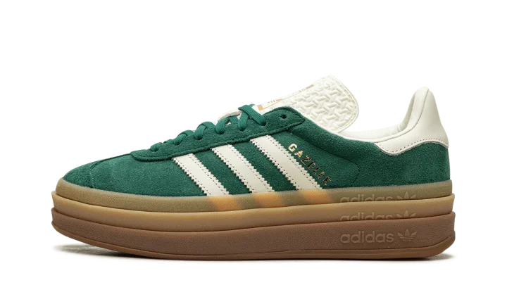 The Women's adidas Gazelle Bold "Green/White" is a women's-exclusive colorway of the retro shoe with a platform-style sole. A contemporary spin on the adidas Gazelle, the Bold edition features a raised sole that provides a boost in height to the wearer. As for the rest of the design, the shoe features a green suede upper with cream leather Three Stripes on the sides. Gold "Gazelle" branding is seen on the lateral side of the shoe. A gold "adidas Gazelle" logo appears on the tongue, while a stacked gum rubber sole completes the look.