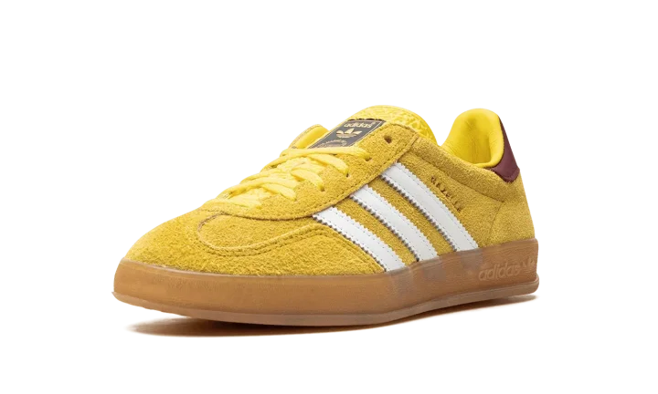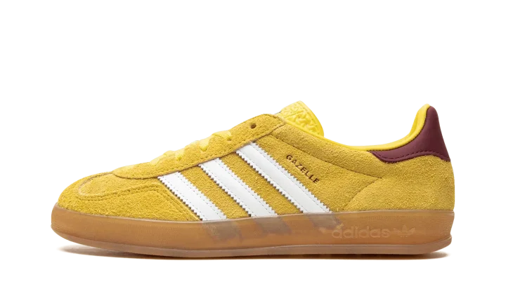 The Women's adidas Gazelle Indoor "Bright Yellow" is a women's colorway of the retro indoor soccer sneaker with a yellow-based design. An eye-catching look, the adidas Gazelle Indoor in "Bright Yellow" features a bold, yellow suede construction with a tonal suede overlay on the toe. Contrasting white leather Three Stripes and gold "Gazelle" branding can be seen on the side of the shoe. A brown leather heel tab adds a contrast of color to the shoe's mostly yellow look. A semi-translucent gum rubber sole completes the design.