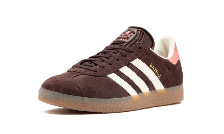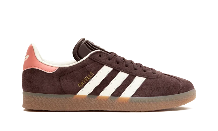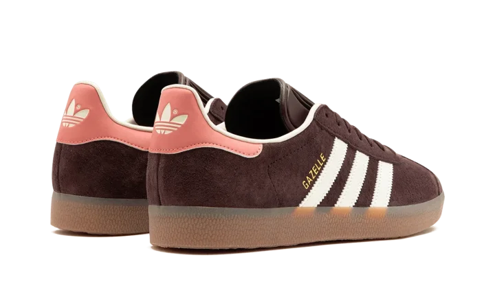 The Women's adidas Gazelle "Shadow Brown" is a women's-exclusive colorway of the retro shoe with an earth tone design. The upper features a Shadow Brown suede construction with tonal suede overlays. Classic white leather Three Stripes and gold "Gazelle" branding appear on the side of the shoe. More adidas branding can be found on the pink leather heel tab and on the tongue. A semi-translucent gum rubber sole completes the look.
