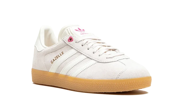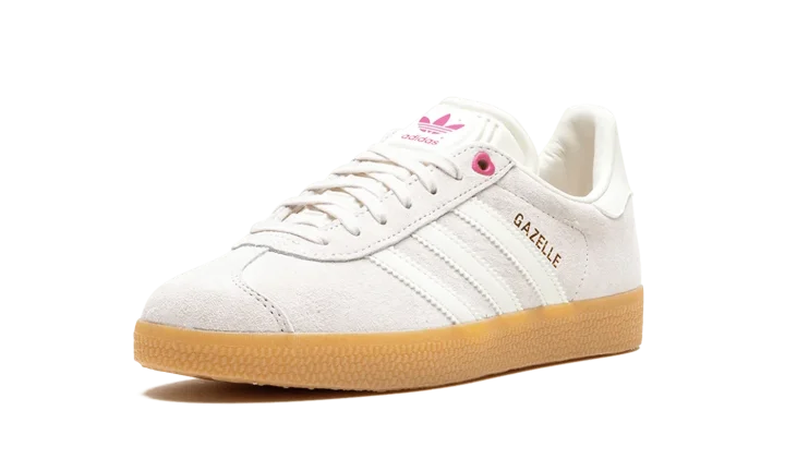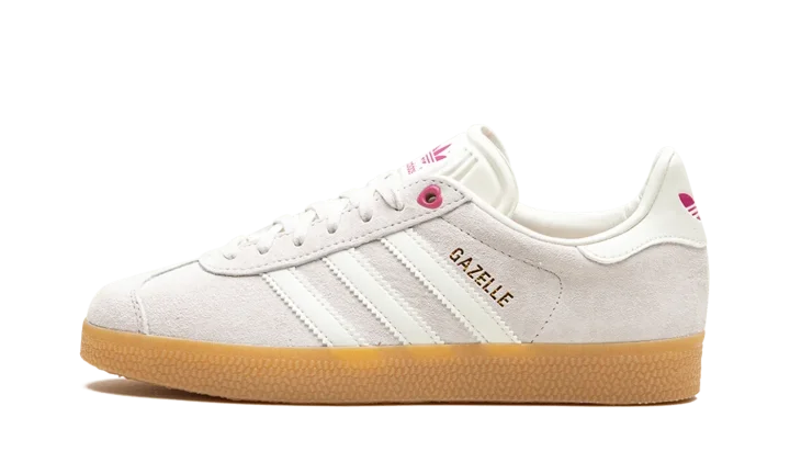 The Women's adidas Gazelle "Valentine's Day" is a women's-exclusive colorway of the retro indoor shoe inspired by the February holiday. With pink accents and a heart-shaped top eyelet, the adidas Gazelle "Valentine's Day" undoubtedly nods to the lover's holiday. The upper is complete with a Putty Mauve-colored suede construction and white leather Three Stripes on the sides. A gold "Gazelle" logo appears on the lateral side, while a Pink Fusion adidas Trefoil logo is seen on the white leather heel tab. Pink "adidas" branding appears on the tongue. Underfoot, a textured gum rubber sole completes the look.