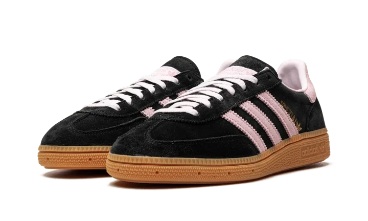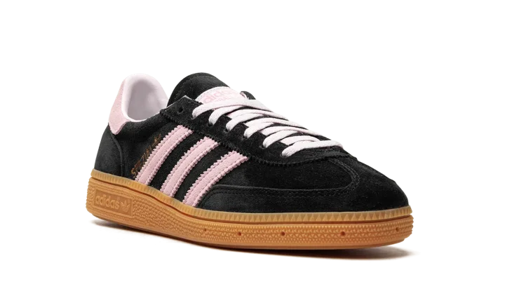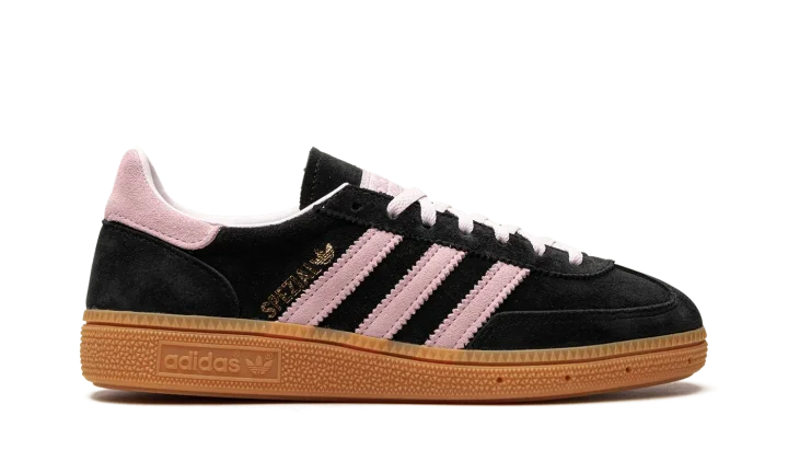 The Women's adidas Handball Spezial "Black/Pink" is a women's-exclusive colorway of the retro sneaker with an easy-to-wear color scheme. Inspired by 1980s-era soccer shoe, the Handball Spezial has a classic yet modern look that allows it to be worn with a variety of casual outfits. On the "Black/Pink" colorway, the upper features a black suede base with pink suede Three Stripes branding on the sides and a gold "Spezial" logo on the lateral side of the midfoot. A pink suede overlay is seen on the heel. Classic adidas Handball Spezial branding is printed on the tongue. A dark gum rubber sole completes the look.