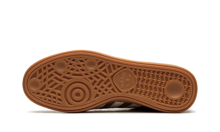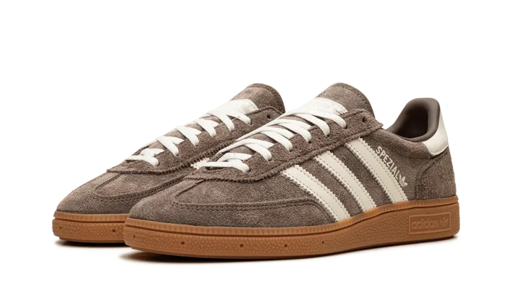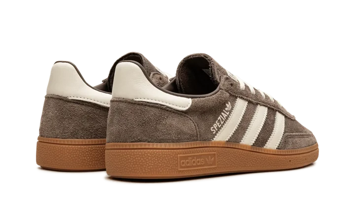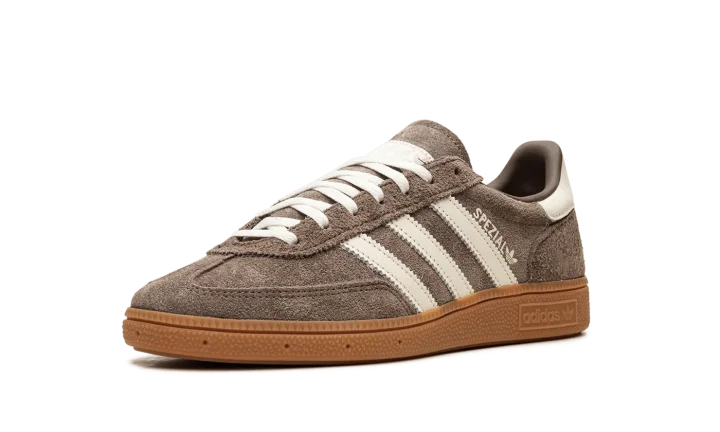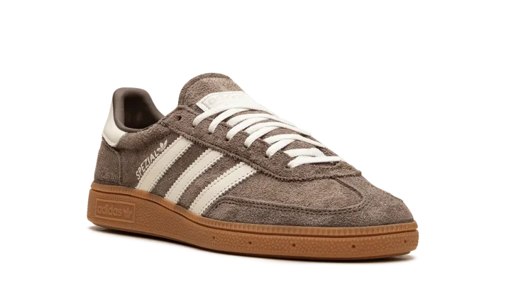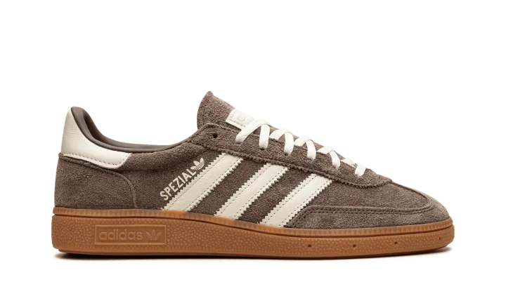The Women's adidas Handball Spezial "Earth Strada/Gum" is a women's-exclusive colorway of the lifestyle shoe with an earth tone color scheme. The upper is complete with an Earth Strada, or brown, suede construction and contrasted with Cream leather Three Stripes branding on the sides. Cream "Spezial" and adidas Trefoil logos appear on the lateral side of the mid-panel, while more cream leather can be found on the heel tab. Underfoot, a gum sole completes the look.
