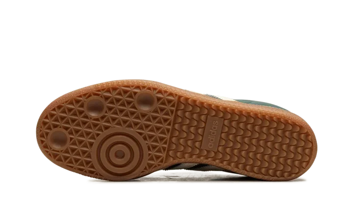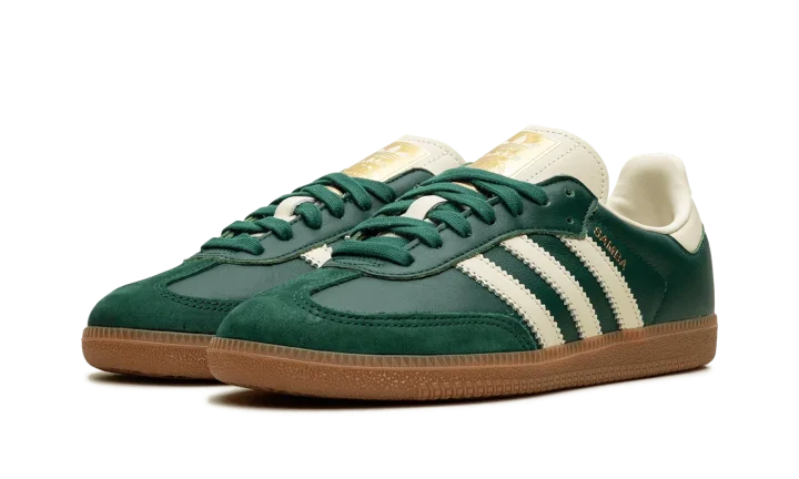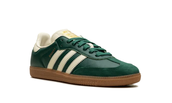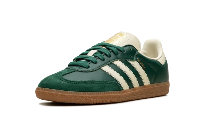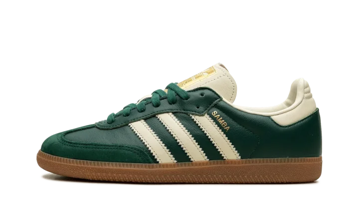 The Women's adidas Samba OG "Collegiate Green" is a women's-exclusive colorway of the retro indoor soccer shoe with a green-based appearance. The adidas Samba is one of the most popular sneakers in the world, and here, its timeless design is featured in a Collegiate Green leather construction. Cream Three Stripes branding appears on the sides, while more cream accenting is found on the leather heel tab and tongue that features classic adidas Samba branding. A gum rubber sole completes the look.