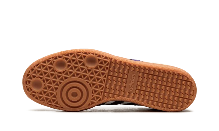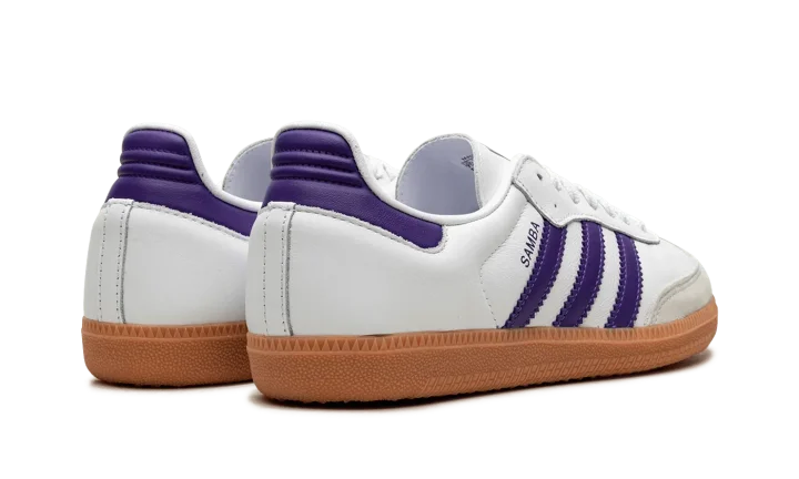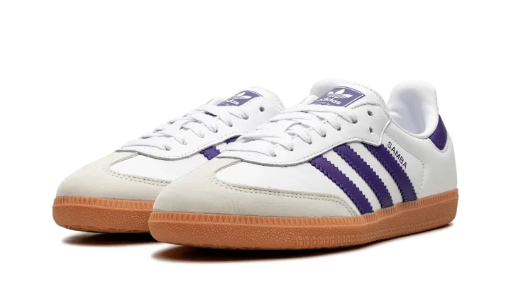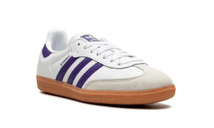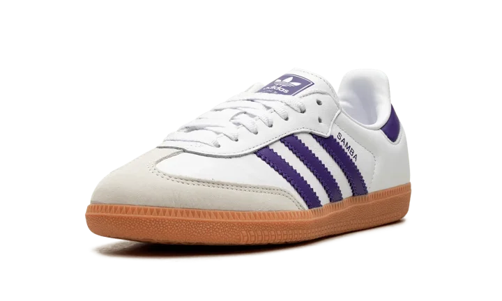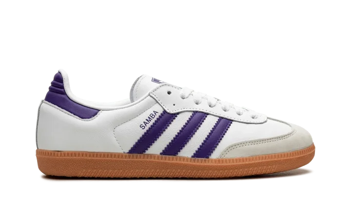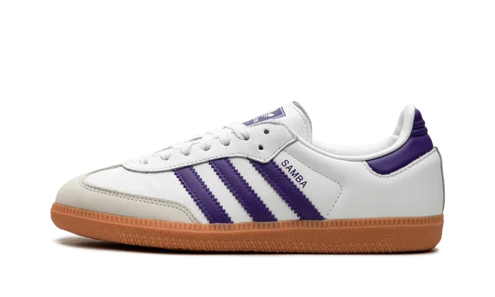 The Women's adidas Samba OG "White/Energy Ink" is a colorway of the retro sneaker with an eye-pleasing, two-tone color block. The Samba in "Energy Ink" features a white leather base and rich purple leather Three Stripes branding on the sides. A gold foil "Samba" logo appears on the lateral side of the midfoot. Classic "adidas" detailing can be found on the tongue. A gum sole rounds out the clean look.