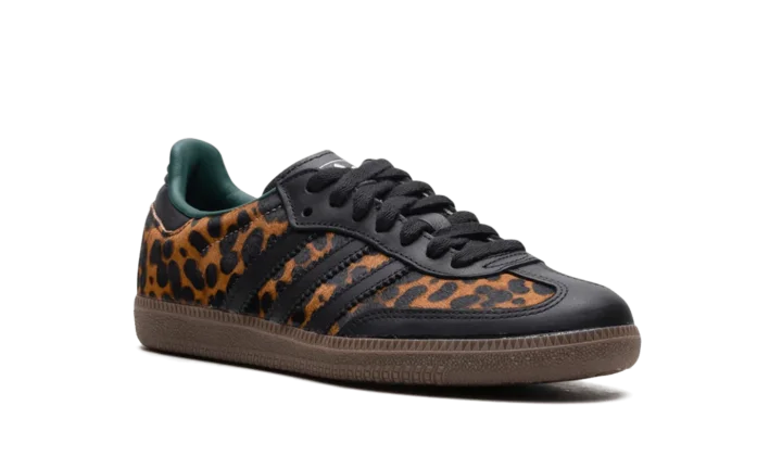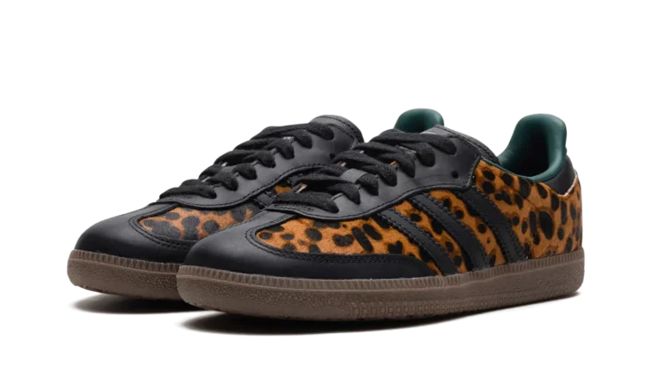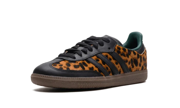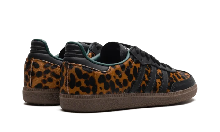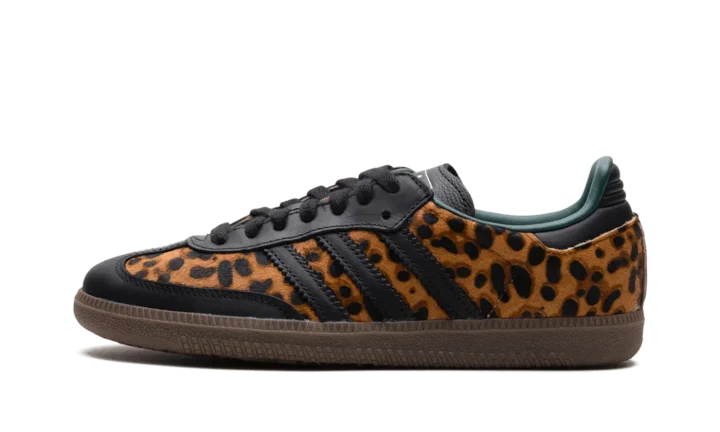 Unleash your wild side with the Adidas Samba OG Leopard Core Black sneakers. This bold iteration of the classic Samba silhouette features a striking leopard print design on the upper, adding a touch of fierce style to the sporty look. The Core Black accents and iconic 3-Stripes provide a classic contrast.