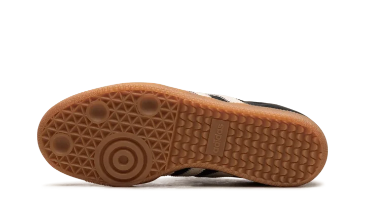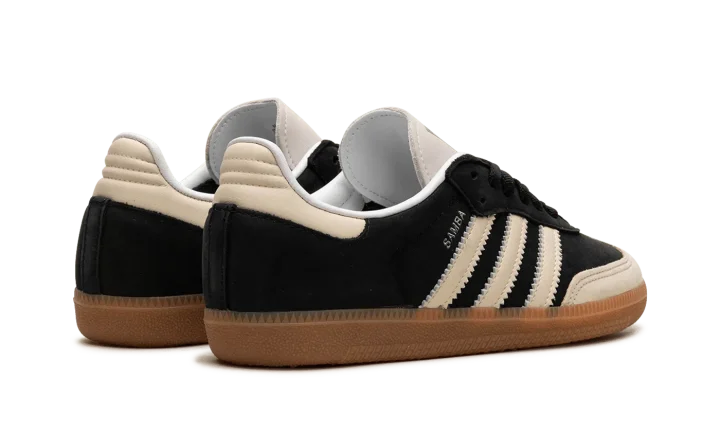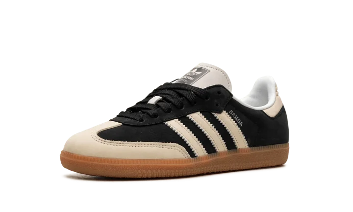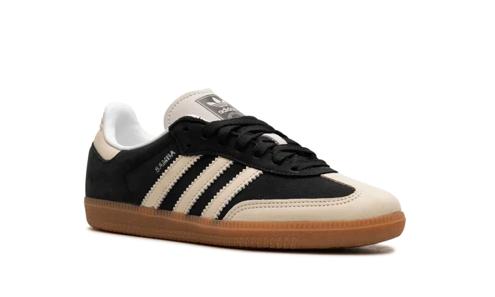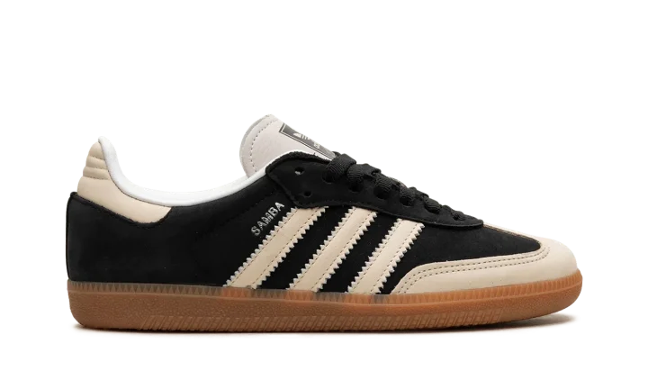 The Women's adidas Samba OG "Black/Wonder White" is a colorway of the classic sneaker with a two-tone, black-and-cream design. The upper features a Core Black suede construction with a Wonder White leather overlay on the toe that matches the hue of the leather Three Stripes branding found on the sides. "Samba" detailing appears on the lateral side of the shoe and an "adidas Samba" patch can be found on the tongue. Underfoot, a gum rubber sole completes the clean look.