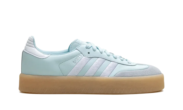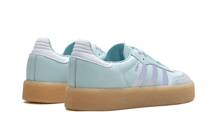 The Women's adidas Sambae "Almost Blue/Silver Metallic" is a women's-exclusive colorway of the version of the retro shoe with a platform sole. Based on the adidas Samba OG, the adidas Sambae features contemporary details such as a thick rubber midsole that gives the shoe a platform-style appearance. On this colorway, the upper has an Almost Blue leather construction with oversized white embroidered Three Stripes on the sides. A white leather panel appears on the heel, while classic adidas branding can be found on the tongue. The platform sole in gum rubber completes the look.