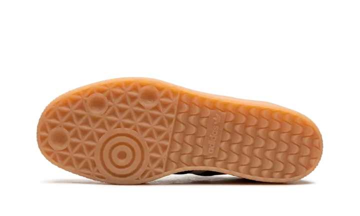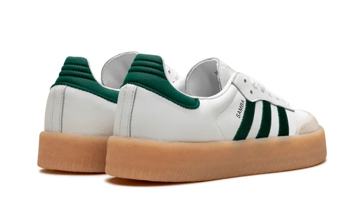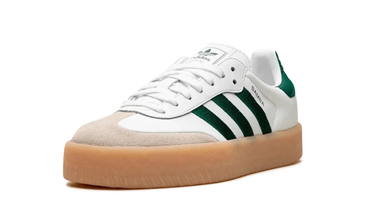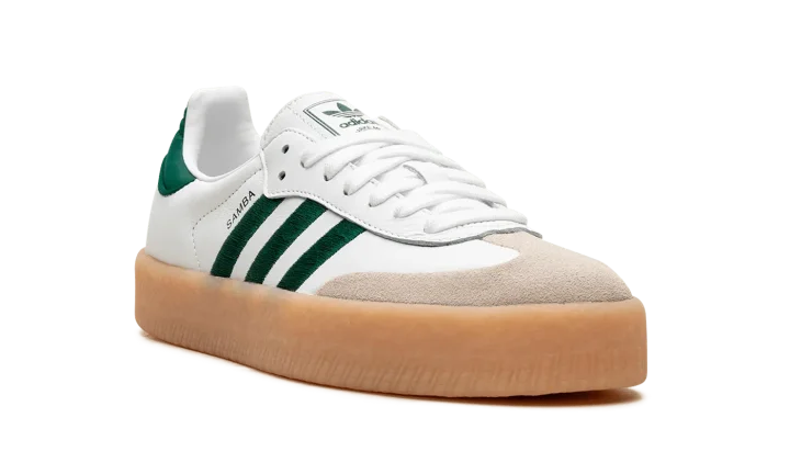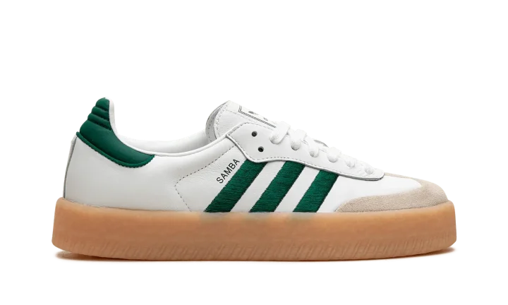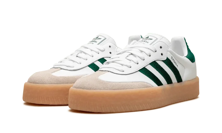 The adidas Sambae "White/Green" is a version of the retro sneaker with contemporary design features. Based on the adidas Samba OG, the Sambae has a thick rubber midsole that gives the shoe a platform-style appearance. The upper features a white leather construction with a tan suede overlay on the toe. Contrasting green Three Stripes branding is located on the sides. A classic "Samba" logo appears on the lateral side of the mid-panel, while an "adidas" logo can be seen on the tongue. The platform sole in gum rubber completes the design.