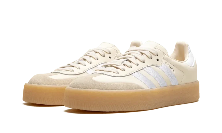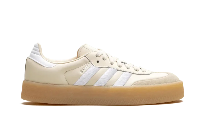 The Women's adidas Sambae "Wonder White/Gum" is a women's-exclusive colorway of the alternate version of the retro shoe. Based on the adidas Samba OG model, the adidas Sambae features contemporary details such as a thick rubber midsole that gives the shoe a platform-style appearance. Here, the upper has a Wonder White leather construction with oversized white embroidered Three Stripes on the sides. A white leather panel appears on the heel, while classic adidas branding can be found on the tongue. The platform sole in gum rubber completes the look.