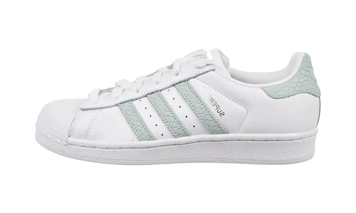The Superstar WMNS 'White Ash Green' shoe features a classic design with a fresh colorway, offering a versatile and stylish addition to any sneaker collection.