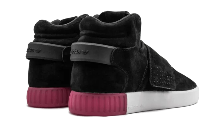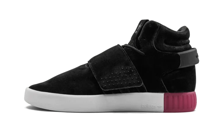 The Adidas Tubular Invader Strap is a new-age sneaker for any woman who prioritizes comfort as much as progressive style. Inspired by the original Adidas Tubular basketball sneaker from the 1980s, this dynamic lifestyle silhouette is updated, featuring a thick Velcro strap accent reaching across the tongue. This Adidas Tubular Invader Strap is outfitted in a premium suede material with a tonal black upper, clean white midsole, and a splash of pink on the EVA-supported heel.