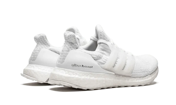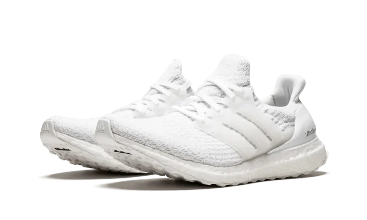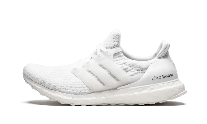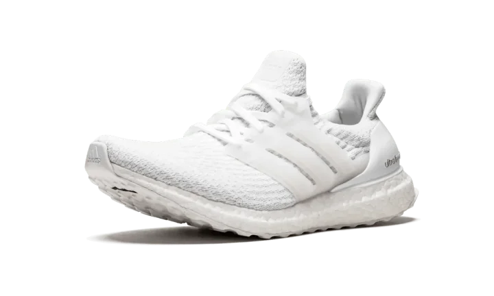 These womens adidas UltraBoost shoes are dressed from top to toe in shades of white. The "Triple White" coloway features a tech white seamless Primeknit upper, full-length boost midsole and crystal white stretch web outsole.
