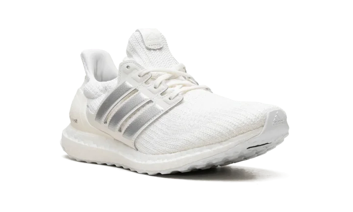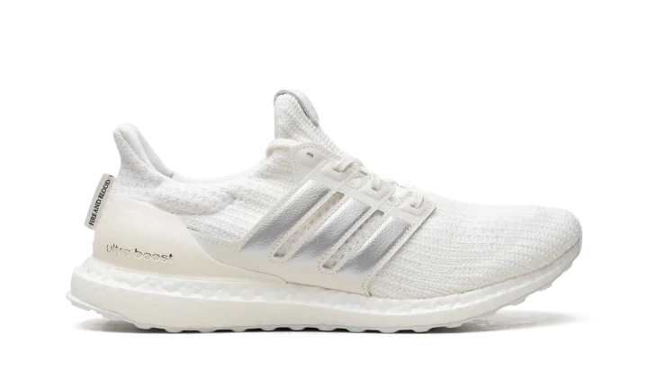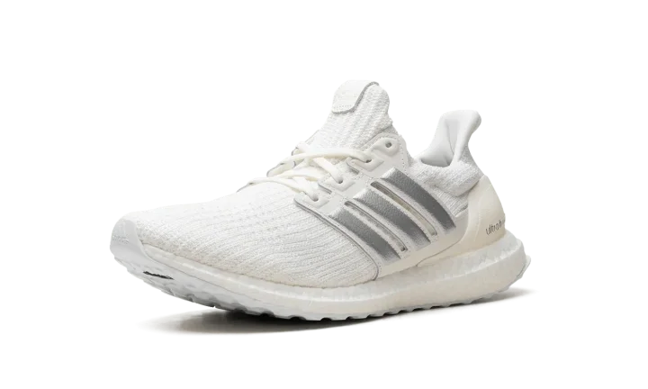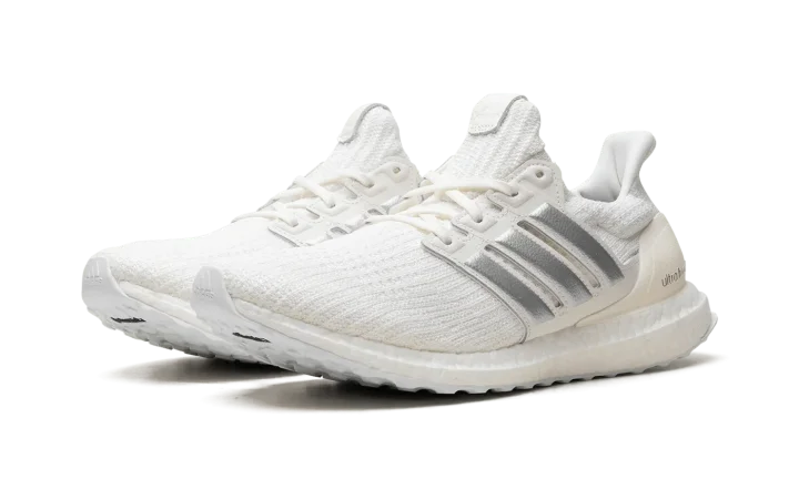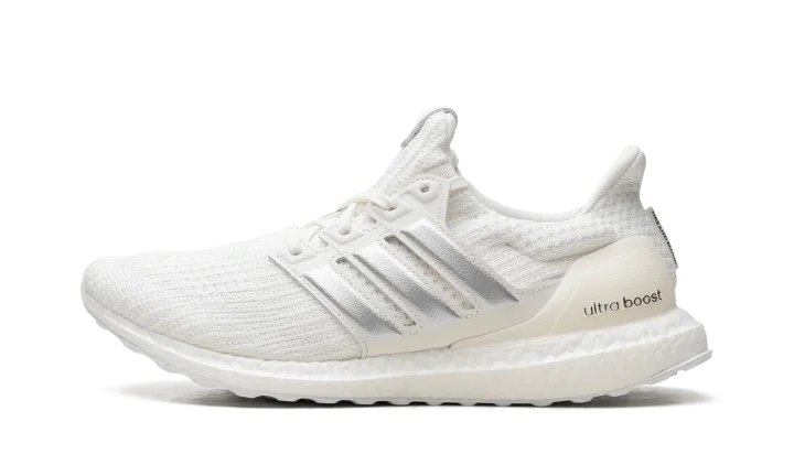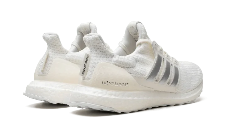 The Game of Thrones x adidas Ultra Boost "House Targaryen" is a women's colorway that is part of the epic collaboration between HBO's "Game of Thrones" series and adidas. This "House Targaryen" Ultra Boost represents the Targaryen family led by Daenerys and her dragons. This colorway in women's sizing features an off-white shade across the Primeknit upper inspired by the family's signature platinum blonde hair. The Primeknit base is overlaid with a leather cage in the same shade that is accented with metallic silver stripes. The heel tab at the rear of the shoe features the Targaryen family motto "FIRE AND BLOOD". The women's Game of Thrones x adidas Ultra Boost "House Targaryen" released on March 22, 2019.