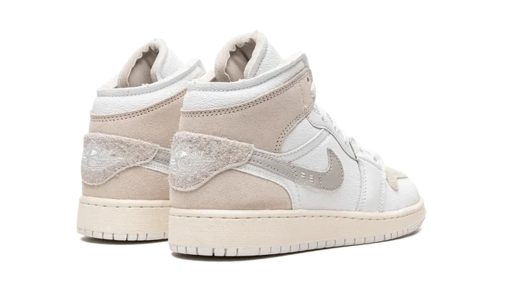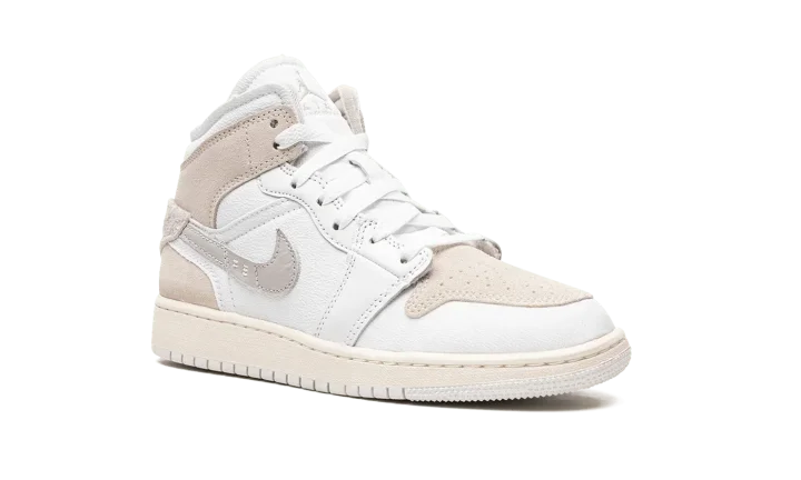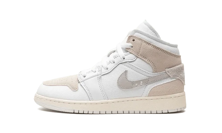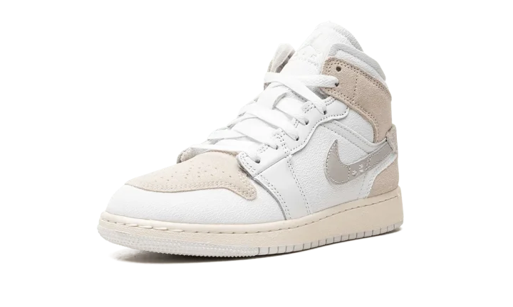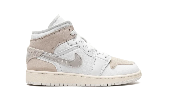 The Air Jordan 1 Mid SE Craft GS "White/Sail" is the youth sizing of the lifestyle sneaker with a deconstructed design. The "White/Sail" features an "inside-out" look that gives the Jordan 1 Mid SE Craft a contemporary vibe. The perforated leather toe panel sits on top of the toe cap—on a standard Air Jordan 1, this is reversed. The suede overlays are designed in an undyed, natural hue that would typically appear on the inside of the shoe. A tan suede Swoosh with orange reinforced bartacking is found on either side.