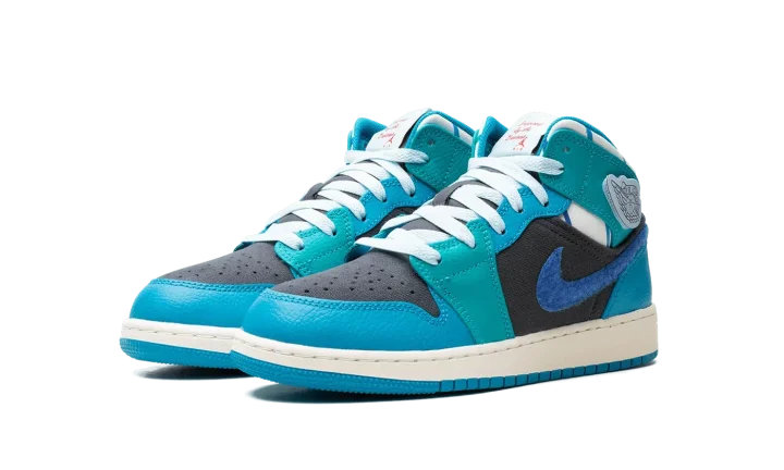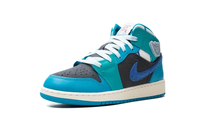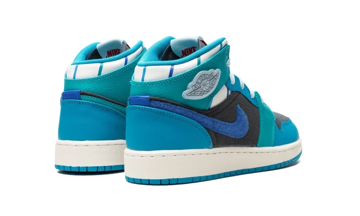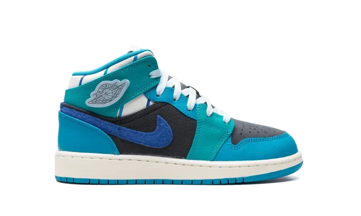 The Air Jordan 1 Mid GS "Inspired by the Greatest" is the youth sizing of the casual shoe in a colorway inspired by Michael Jordan's career accomplishments. The Jordan 1 Mid "Inspired by the Greatest" is a kids-exclusive colorway, and features an interesting combination of colors and materials on its design. The upper is complete with a black mesh base contrasted with Glacier Blue and Aquatone leather panels. Blue velcro Swooshes are attached to the sides of the shoe, and classic "Wings" branding appears on the collar. An "Inspired by the Greatest" logo can be found on the tongue tag