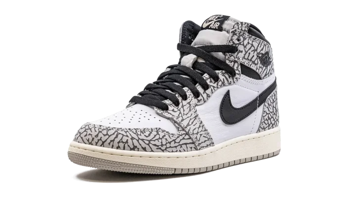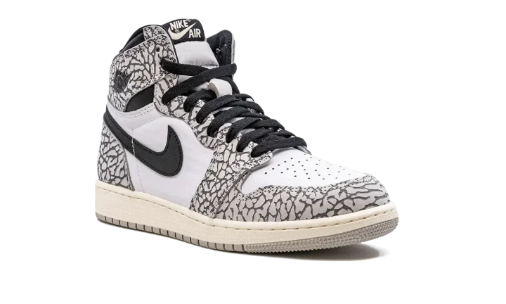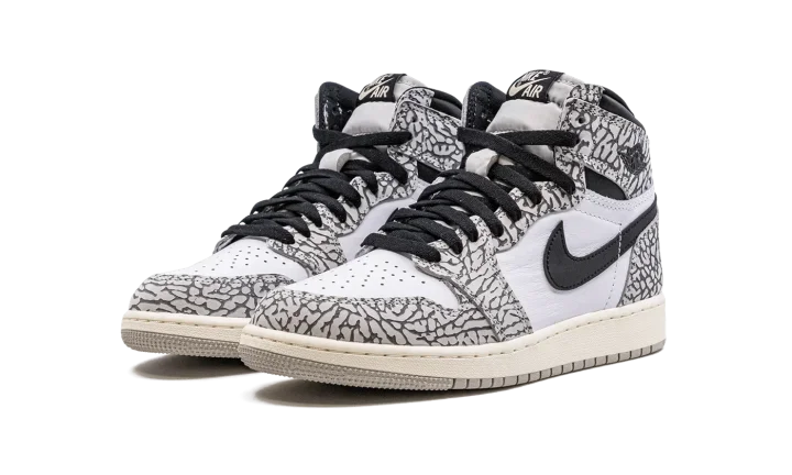The Air Jordan 1 High OG GS "Elephant Print" is the youth sizing of the colorway of the retro basketball shoe inspired by the classic elephant patterning found on the Air Jordan 3. The "White Cement's" overlays have the same iconic elephant print that debuted on the Jordan 3 in 1988. As for the rest of the design, the shoe features a white leather base with the aforementioned Cement-colored elephant print overlays. A black Swoosh is located on either side of the shoe. A black "Wings" logo is located on the collar and white "Nike Air" detailing appears on the tongue tag. Underfoot, the vintage-inspired Sail rubber midsole is paired with a grey outsole.