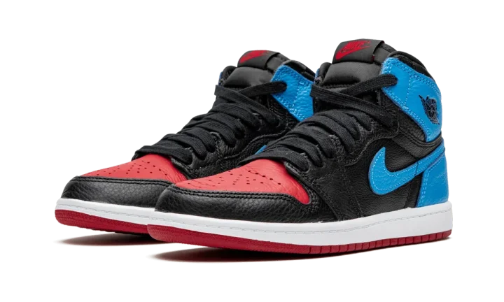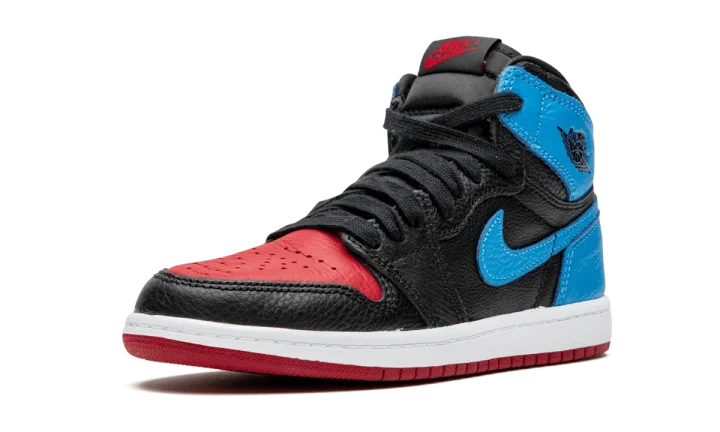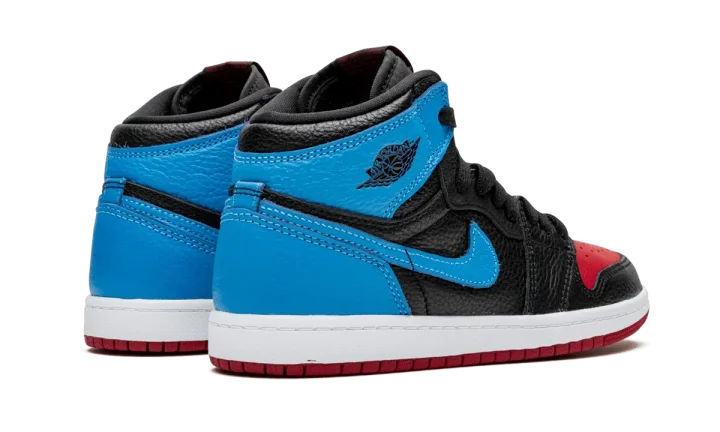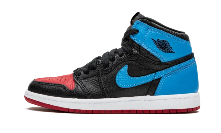 The Air Jordan 1 PS "UNC to Chicago" is the preschool sizing for the colorway that combines the team uniform colors of the two teams most closely associated with Michael Jordan during his basketball career. The amalgamation look features University Blue leather detailing on the Swoosh and quarter panel is contrasted by fiery red leather on the perforated toe. Buttery black leather can be found on the mid-panel, forefoot, and ankle collar. Traditional Jordan 1 "Wings" detailing is located on the collar. The look is finished off with a classic white midsole and bold red outsole. The Air Jordan 1 PS "UNC to Chicago" was released on February 13, 2020.