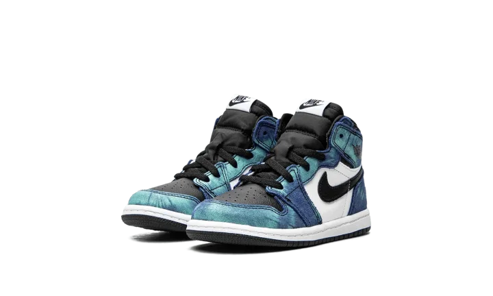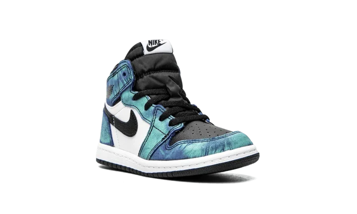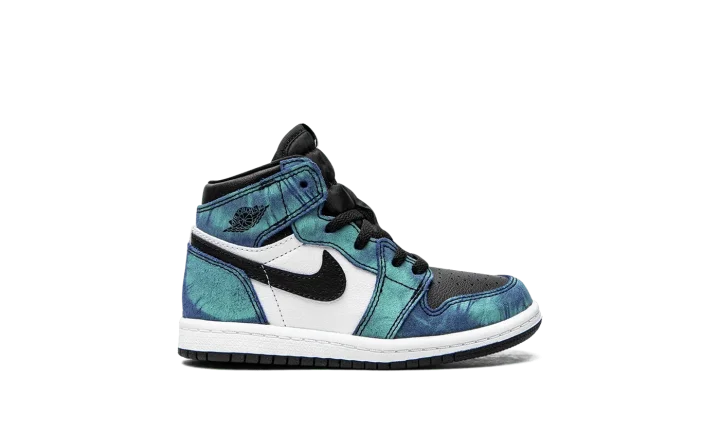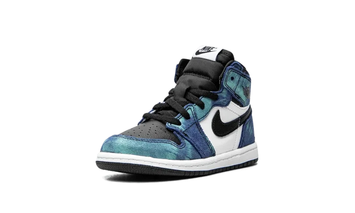 The Air Jordan 1 TD "Tie-Dye" is the toddler sizing of the high-top silhouette in a breezy summer colorway. Released in Summer 2020, this vivacious design trimmed down in size to fit the tiny feet of babies displays a tropical aesthetic with blue and green tie-dye leather overlays on the forefoot, collar, and heel. Black leather dots the perforated toe box and white leather appears on the mid-panel. Black leather Swooshes can be found on each side and a black Wings logo is placed onto the collar. A contrasting white midsole and black outsole finish the look of this charming colorway. The Air Jordan 1 TD "Tie-Dye" was released on June 26, 2020.
