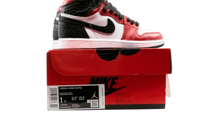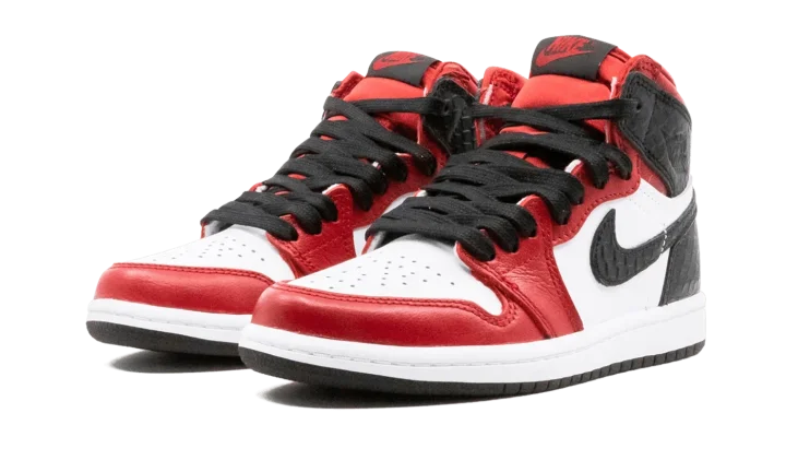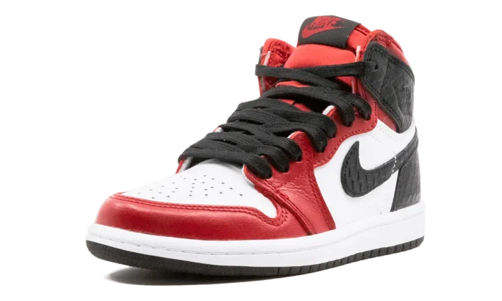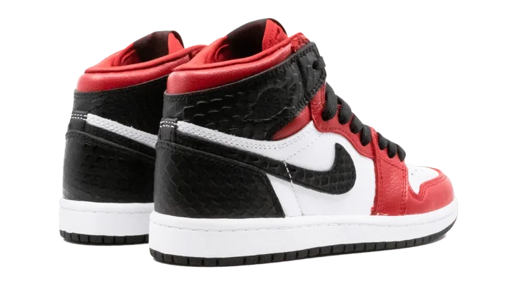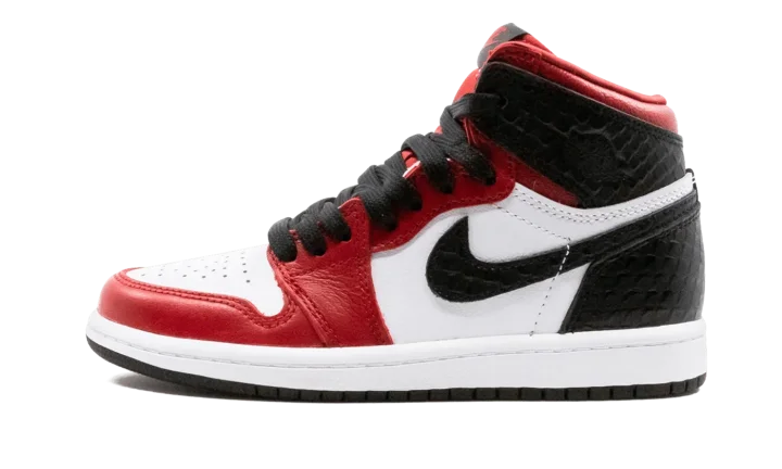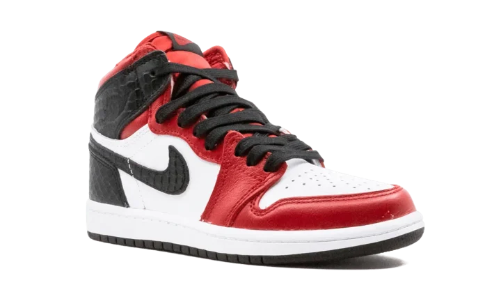 The Air Jordan 1 PS "Satin Snake" is the preschool sizing of the reptilian colorway of Michael Jordan's first signature shoe. Based on the "Chicago" design, the "Satin Snake" explores a new approach to casual lifestyle aesthetics by replacing the traditional leather panels of the previously mentioned colorway in favor of luxurious faux snakeskin. The upper displays a color block close to the original "Chicago," as white leather can be found on mid-panel and perforated toe. Contrasting red leather overlays appear on the forefoot, eyelets, and collar. A black snakeskin leather covers the Swoosh, ankle collar, and heel. Jordan Brand opts with red satin for both the tongue and inner lining. This upscale Jordan 1 for preschoolers is finished off with black waxed cotton laces for a rather opulent look. The Air Jordan 1 PS "Satin Snake" was released on August 6, 2020.