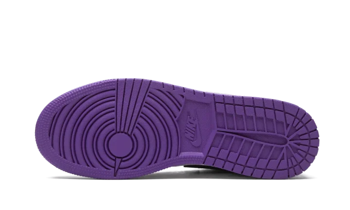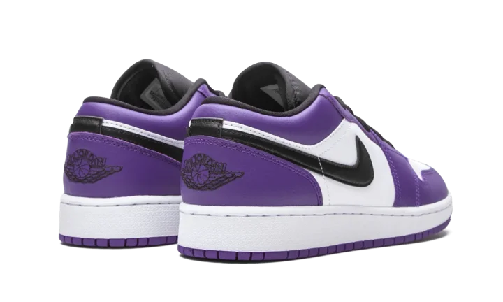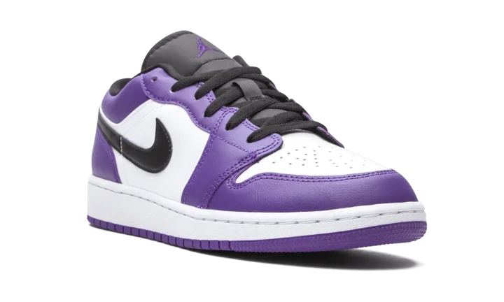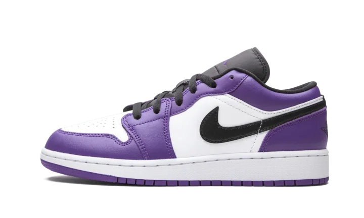 The Air Jordan 1 Low GS "Court Purple" is the youth sizing of Michael Jordan's first signature shoe in low-top height in a regal colorway. The "Court Purple" follows a long line of purple based Jordan 1s that are among the most popular non-original makeups of the iconic shoe on the market today. Design details include Court Purple synthetic leather overlays on the forefoot, eyelets, collar, and heel and white synthetic leather on the perforated toe and mid-panel. Branding appears in the form of a black synthetic leather Swoosh on either side, black "Wings" embroidery on the purple heel, and a Court Purple Jumpman on the black nylon tongue. Black shoe laces, a white rubber midsole, and contrasting purple outsole finish off the look for this Air Jordan 1 Low in youth sizing.