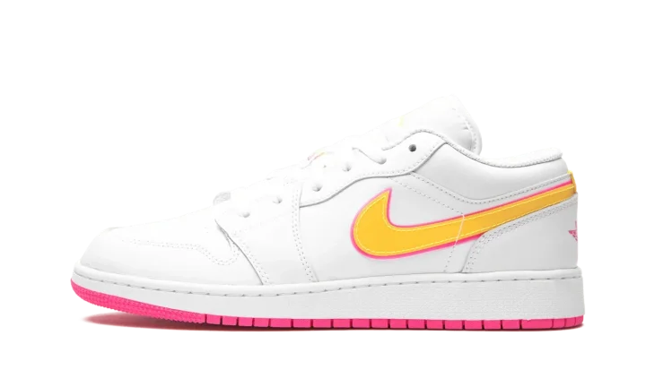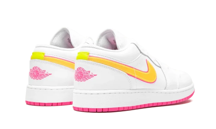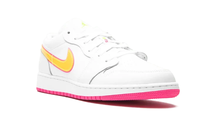 The Air Jordan 1 Low GS "Edge Glow" is the youth sizing of the summertime inspired colorway of Michael Jordan's first signature shoe. In low-top form, the Air Jordan 1 Low is wearable, comfortable, and always in style. Those superlatives describe the "Edge Glow," as well. The upper features smooth white leather on the mid-panel, collar, and heel. A perforated toe and tonal overlays on the forefoot, collar, and heel add additional styling to the look of the shoe. Jordan Brand places a Venom Yellow leather Swoosh with Pink Blast accenting on either side for a unique look that appeals to kids. Lime green and pink embroidered "23" detailing appears on the lace overlay and a small green Jumpman dots the white leather tongue to finish the look.