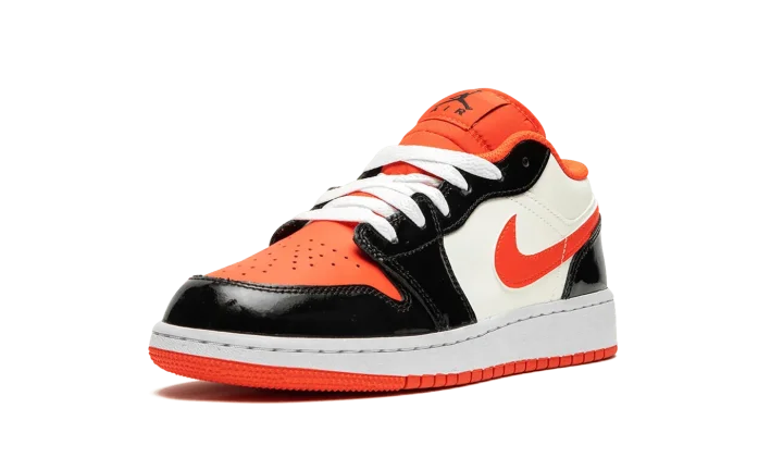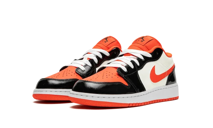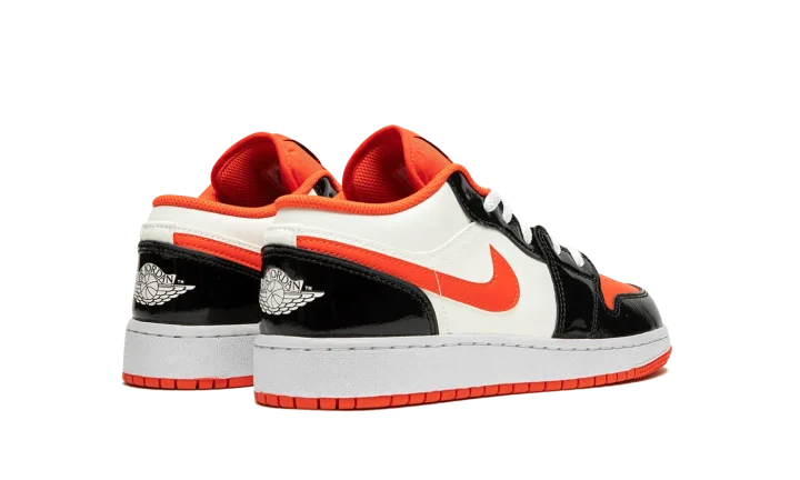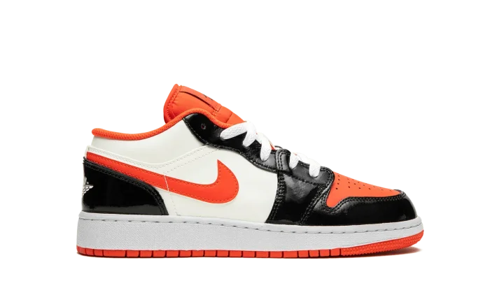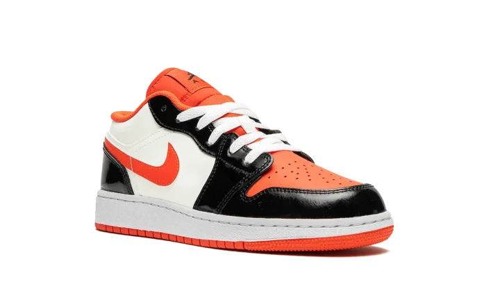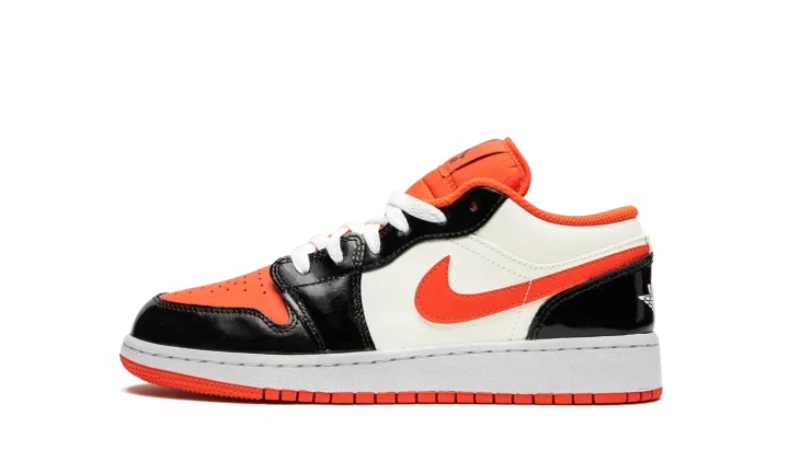 The Air Jordan 1 Low GS "Halloween" is the youth sizing of the retro basketball shoe in a colorway inspired by the spooky holiday. The Jordan 1 Low GS in the "Halloween" colorway features a white leather construction with contrasting shiny black leather overlays on the toe cap, forefoot, eyelets, and heel. Team Orange accenting can be found on the perforated leather toe, on the Swoosh, and on the nylon tongue and inner lining. A black Jumpman is paired with a black "Air" logo on the tongue tag. A "Wings" detail appears on the heel.
