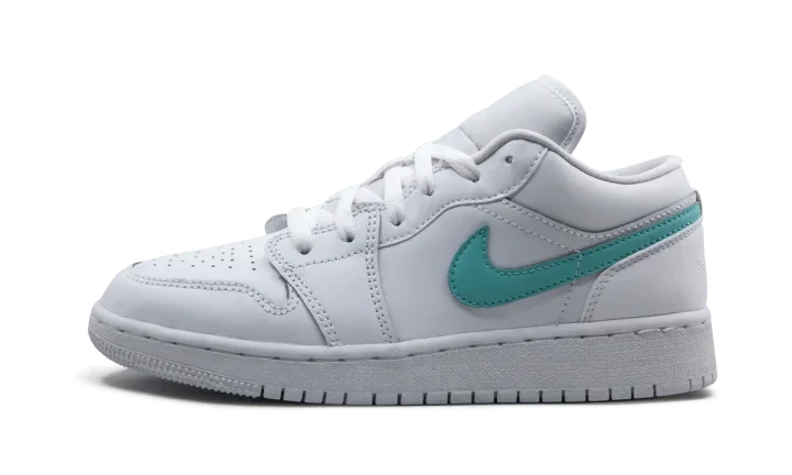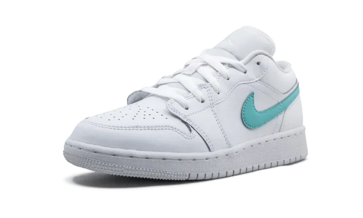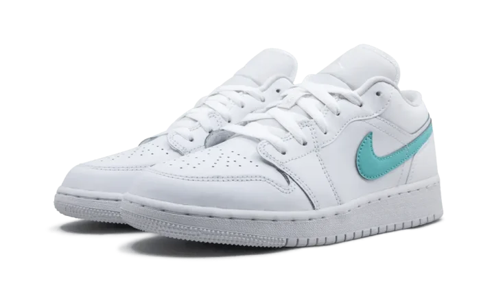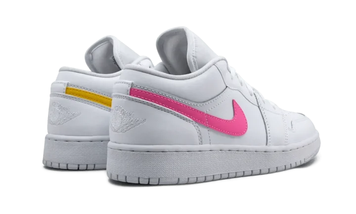 The Air Jordan 1 Low GS "Multicolor Swoosh" is the youth sizing of Michael Jordan's first signature shoe in an appealing colorway for children. Timeless and versatile, the Jordan 1 Low is one of the most popular silhouettes under Jordan Brand's umbrella of footwear classics. Here, the "Multicolor Swoosh" features super crisp white leather detailing on the perforated toe, mid-panel, collar, and heel. As its name suggests, this shoe displays different colored leather Swooshes. The left shoe features a Light Aqua leather Swoosh on the outside and yellow leather Swoosh hit on the medial side. The right shoe displays pink and neon green Swooshes on the outside and inside of the shoe, respectively. Tonal Jumpman embroidery can be found on the white nylon tongue. A white nylon tongue and white "Wings" branding on the heel complete the appearance of this Jordan 1 Low in youth sizing.