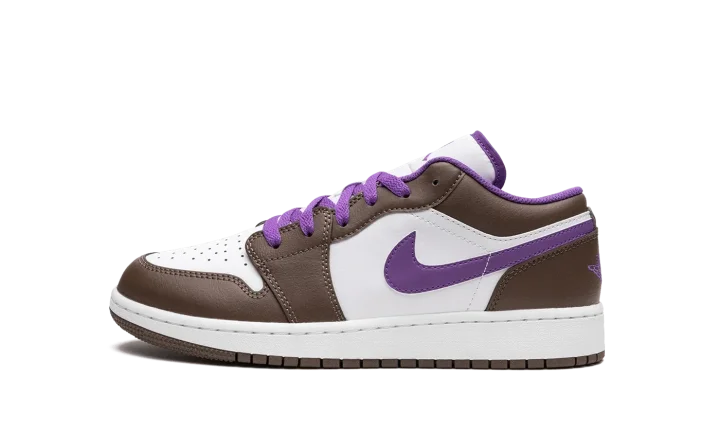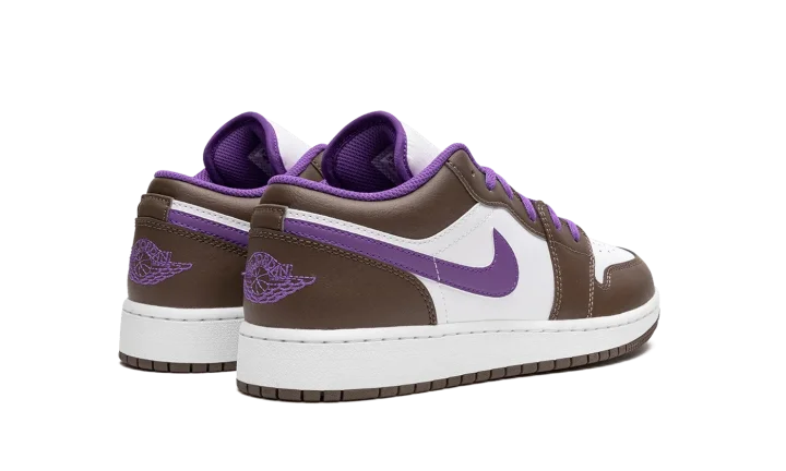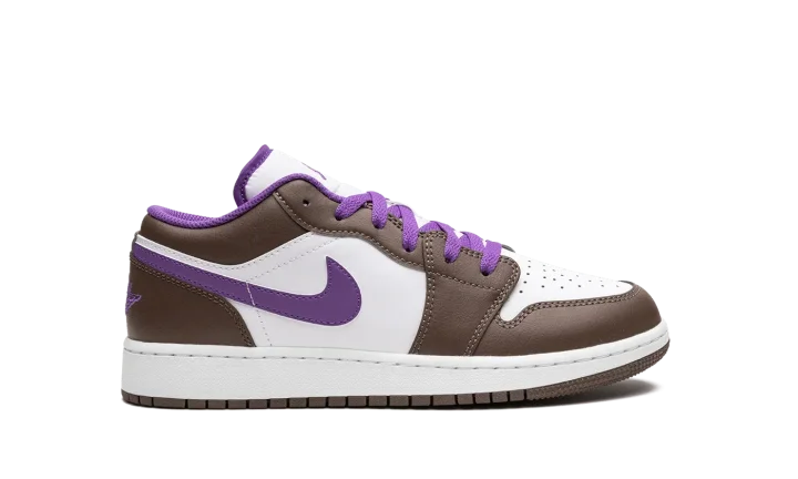 The Air Jordan 1 Low "Purple/Mocha" (or officially "Palomino/Wild Berry") is the youth sizing for a colorway of the low-top retro basketball shoe with a unique appearance. Keeping things clean and versatile, the shoe is equipped with a white leather base that gives way to contrasting Palomino (brown) leather overlays. A Wild Berry (purple) leather Swoosh is found on either side of the shoe. Purple "Wings" branding is embroidered on the heel. Additional purple accenting can be found on the Jumpman on the tongue. Underfoot, a white rubber midsole and brown rubber outsole complete the look. Release date: March 1, 2023