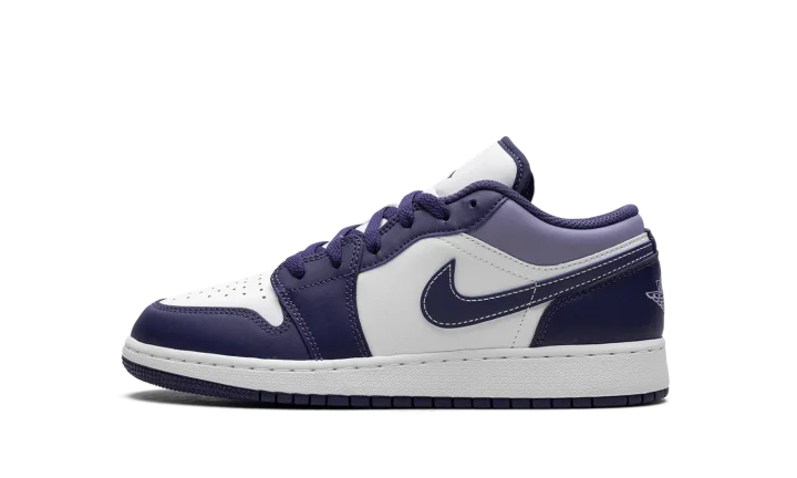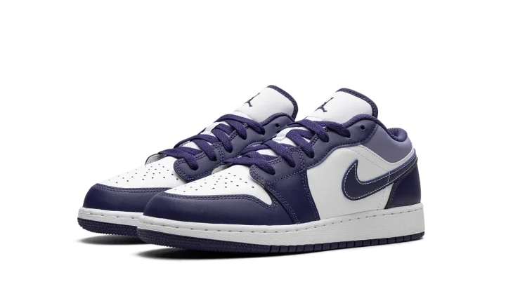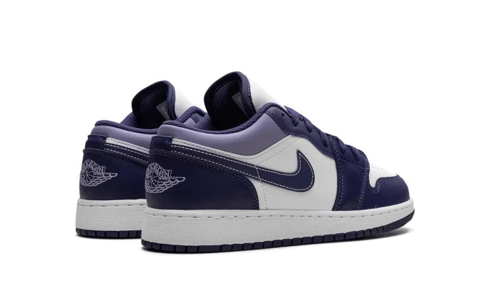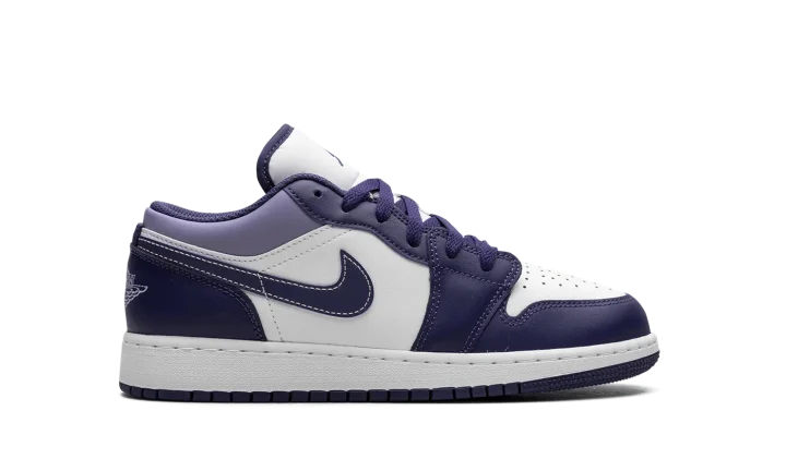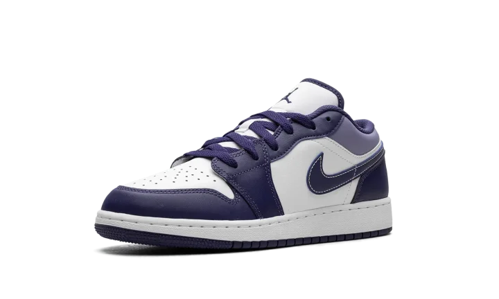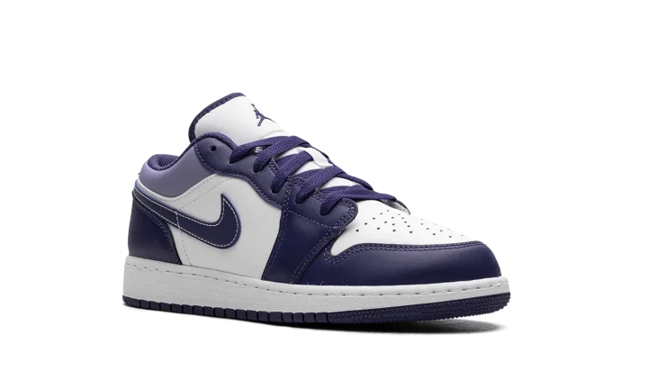 The Air Jordan 1 Low GS "Sky J Purple" is the youth sizing of the colorway of the retro basketball shoe with purple accents. The colorway has a white leather upper with Sky J Purple leather overlays and Swoosh branding. A lighter shade of purple appears on the collar. A classic "Wings" logo is embroidered on the heel while a purple Jumpman is found on the tongue. The shoe's two-tone look continues underfoot with a white rubber midsole and purple rubber outsole. Release date: July 20, 2023