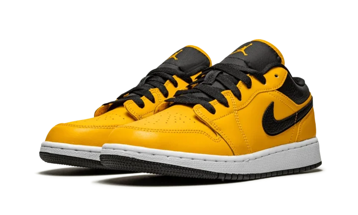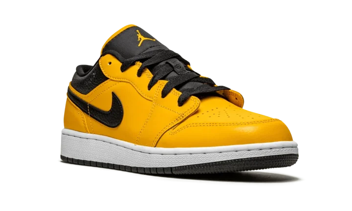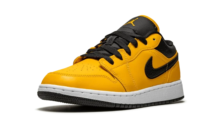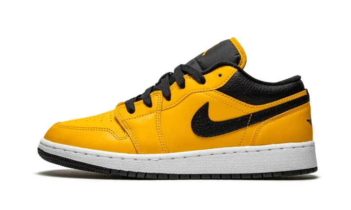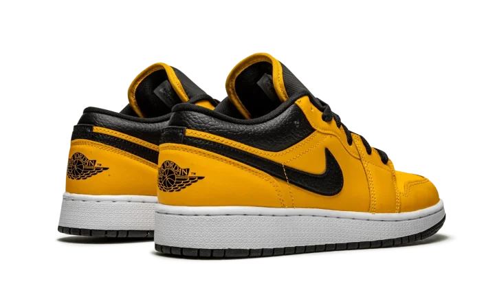 The Air Jordan 1 Low GS "University Gold/Black" is a youth version of Michael Jordan's first signature shoe that turns heads with a vibrant color scheme. The alternate Jordan 1 Low has become one of the most sought after Air Jordan styles in recent years due to the model's wearability and exciting colorways like the "University Gold/Black." Jordan Brand constructs the leather upper in University Gold, save for the black tumbled leather Swoosh branding on the mid-panel and black leather detailing around the collar. A black "Wings" emblem is embroidered onto the back of the shoe and a yellow Jumpman appears on the black nylon tongue. A white midsole and black outsole round out the look.