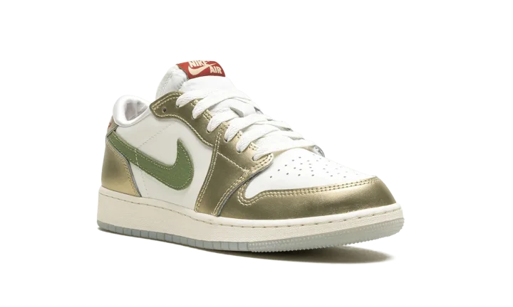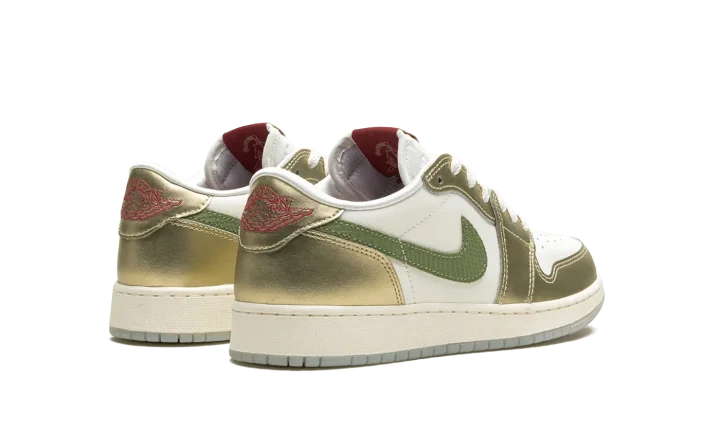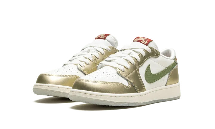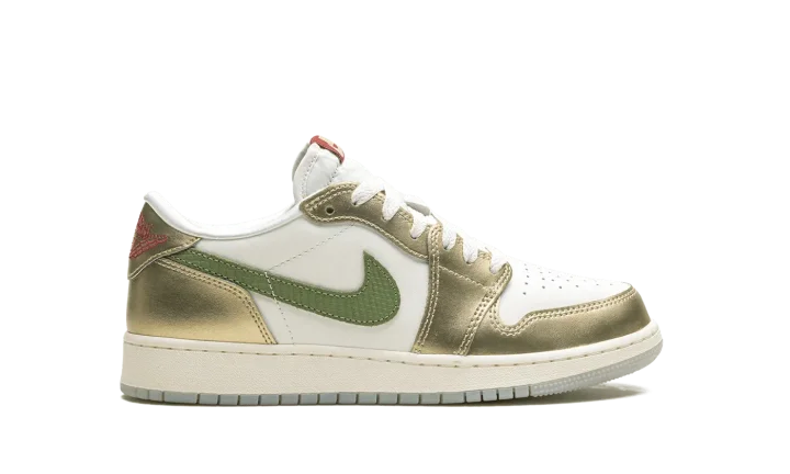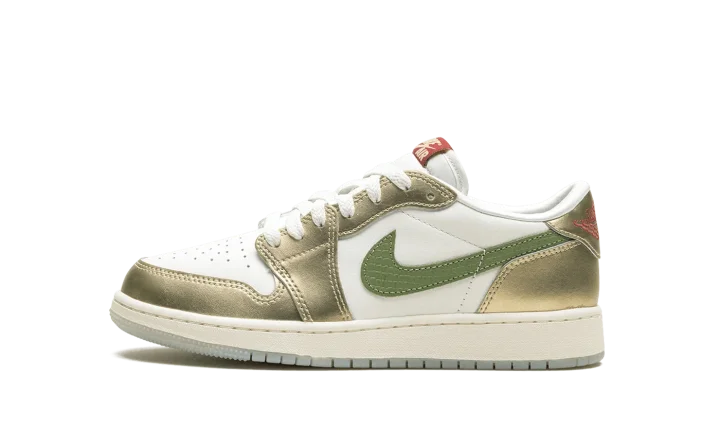 The Air Jordan 1 Low OG GS "Year of the Dragon" is the youth sizing of the retro basketball shoe inspired by the traditional Chinese holiday. From a collection of "Chinese New Year" or "Lunar New Year" colorways by Jordan Brand and Nike, the Jordan 1 Low OG "Year of the Dragon" celebrates the Chinese holiday in 2024 with unique design details. The upper has a Sail leather base with flashy Metallic Gold overlays, and a green scaled Swoosh that pays homage to the revered dragon in Chinese culture. Red "Wings" detailing can be found on the Metallic Gold leather heel tab. More Dark Red accenting appears on the tongue tag with "Nike Air" branding. Release date: January 24, 2024