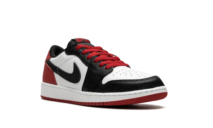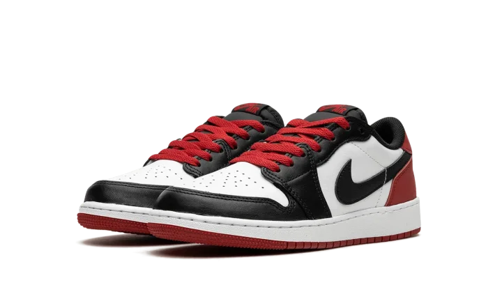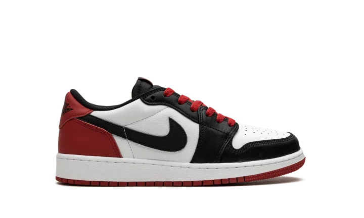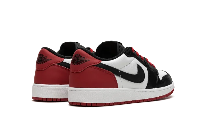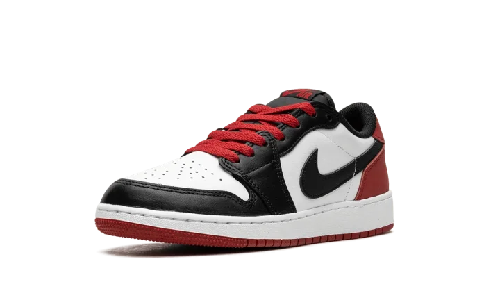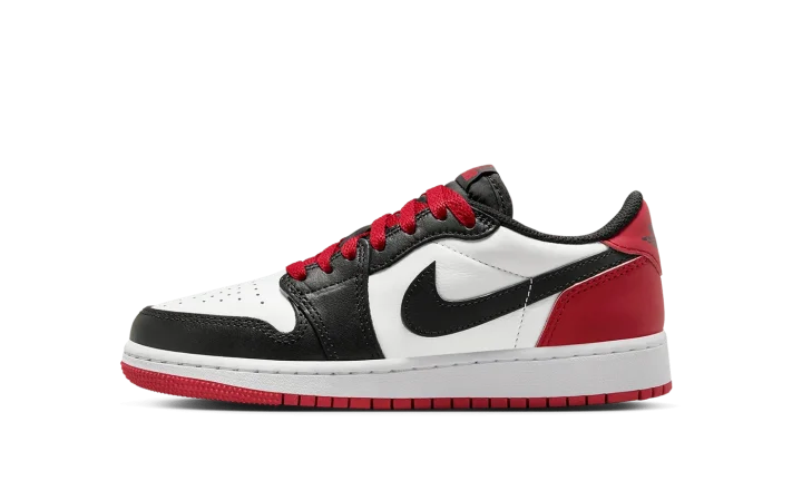 The Air Jordan 1 Low OG GS "Black Toe" is the youth sizing of the classic retro basketball shoe that shows love to one of the model's original styles. The "Black Toe" was an original colorway of the Air Jordan 1 High in 1985, and was worn by Michael Jordan with the Chicago Bulls during his rookie season in the NBA. The colorway is transferred onto the Jordan 1 Low OG here. The shoe features a white leather base with black leather overlays on the toe cap, forefoot, and eyelets. A black leather Swoosh logo appears on the sides. Varsity Red leather can be found on the heel, as can a black "Wings" logo on the heel tab. Classic "Nike" and Swoosh branding appear on the tongue tag. A white rubber midsole and black rubber outsole complete the look. Release date: July 28, 2023