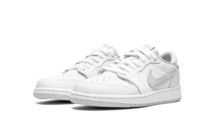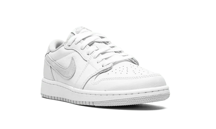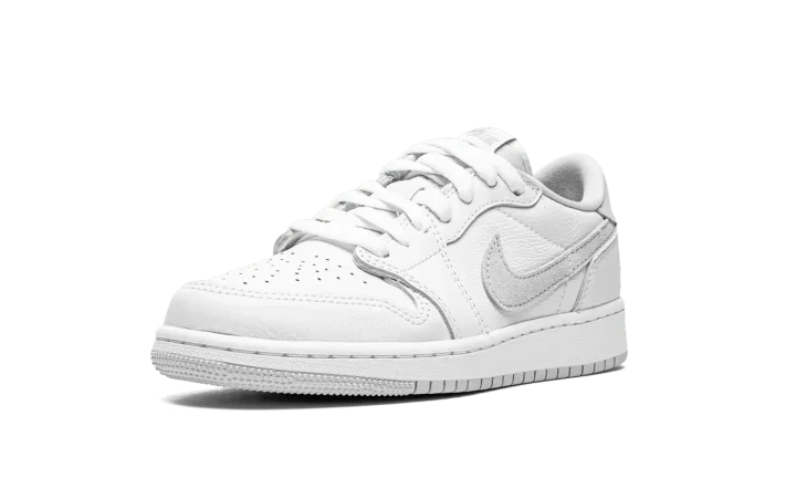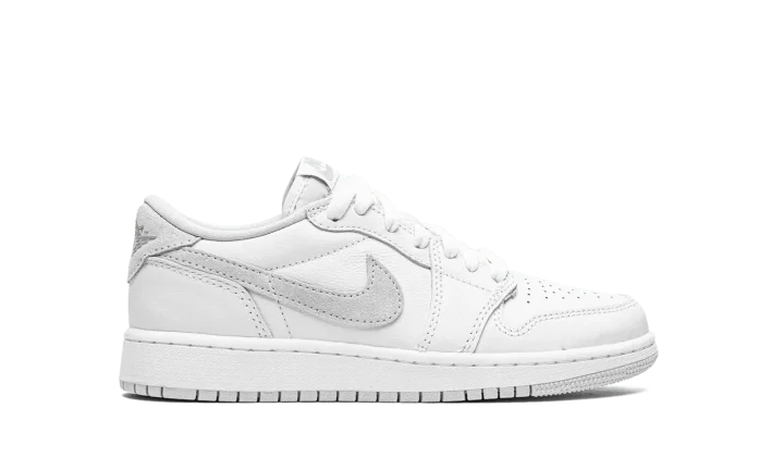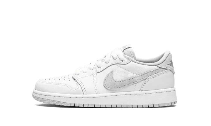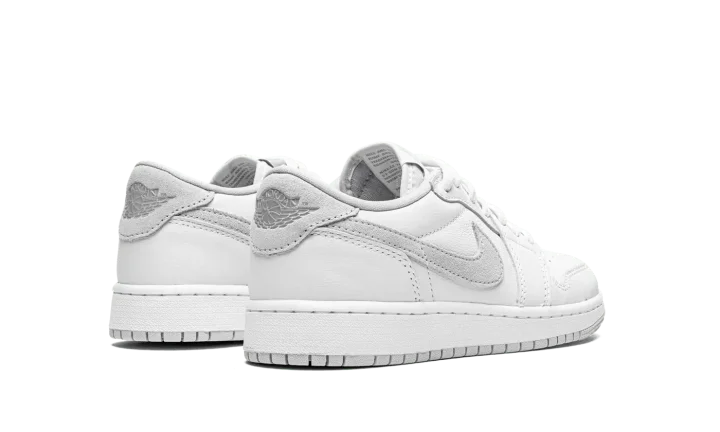 The Air Jordan 1 Low OG GS "Neutral Grey" is the grade school sizing of the June 2021 re-release of an original colorway of the low-top edition of Michael Jordan's first signature shoe. The modern "Neutral Grey" on the popular Jordan 1 Low is not quite a one-to-one remake of the first low-top "Neutral Grey," though it is nonetheless a desirable look for the versatile shoe by Jordan Brand. Unlike the 1985 and succeeding 2015 Europe-only release of the low-top "Neutral Grey," the modern incarnation features Neutral Grey-colored suede materials on the Swoosh and heel tab. The upper displays a white leather construction. Grey "Nike Air" and Swoosh branding appears on the white nylon tongue tag on the white nylon tongue. Release date: June 24, 2021