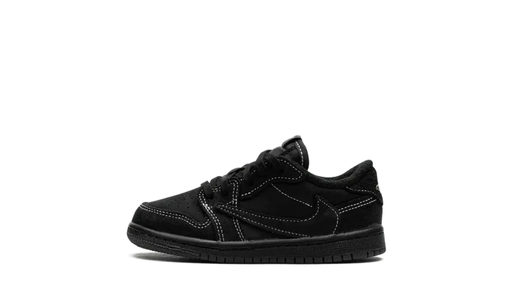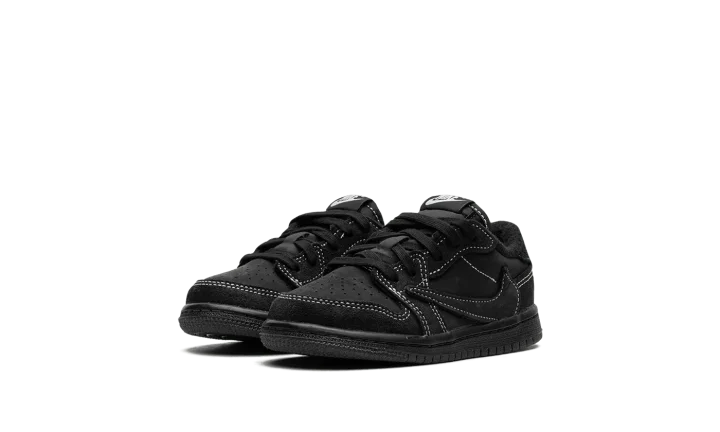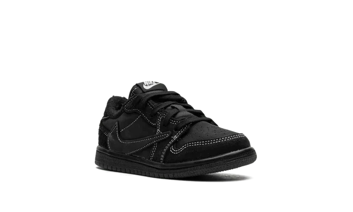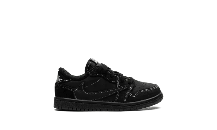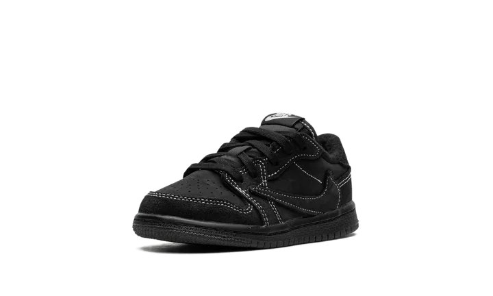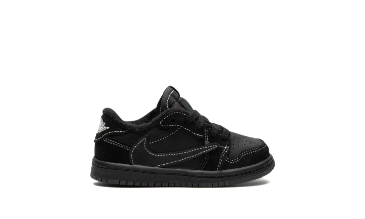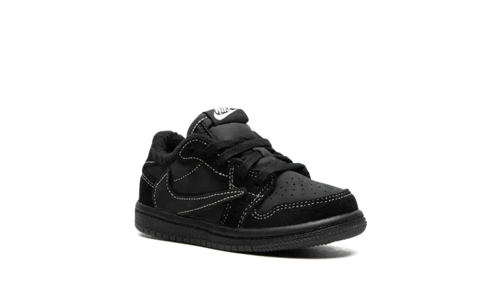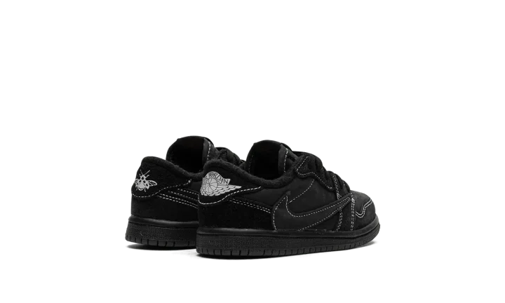 The Travis Scott x Air Jordan 1 Low OG TD "Black Phantom" is the toddler sizing of the limited edition collaboration by the hip-hop star for a mostly monochromatic black colorway of Michael Jordan's first signature shoe. The "Black Phantom" continues the Houston native's collaborative run of Air Jordan 1s in a big, albeit somewhat unexpected way, by applying a versatile, mostly black design to the popular sneaker. The shoe's black nubuck upper is paired with tonal suede overlays that feature white contrast stitching. Travis's signature reverse Swoosh logo is found on the lateral side of the shoe with white contrast stitching, while a standard Swoosh appears on the medial side. Mismatched heel tabs featuring a "Wings" logo on the right shoe and an embroidered bee design on the left shoe add another layer of intrigue to the design. Release date: December 15, 2022