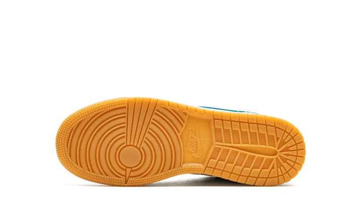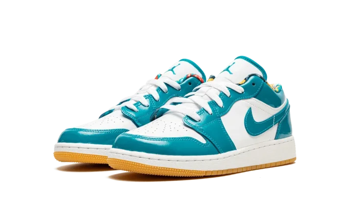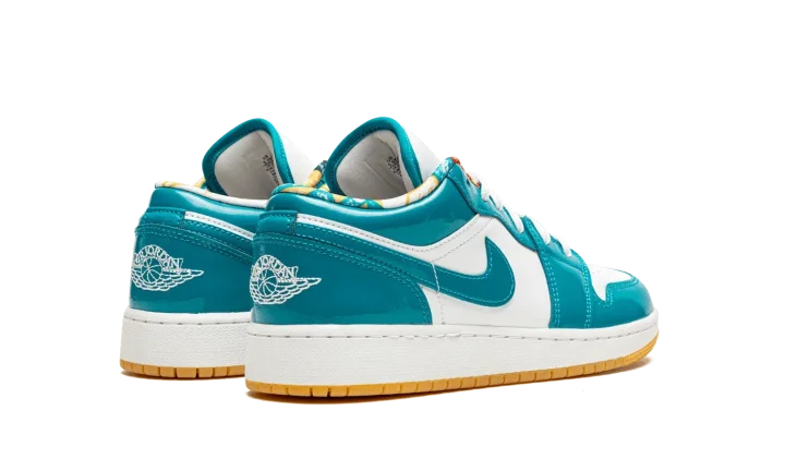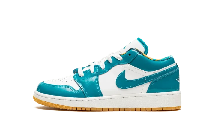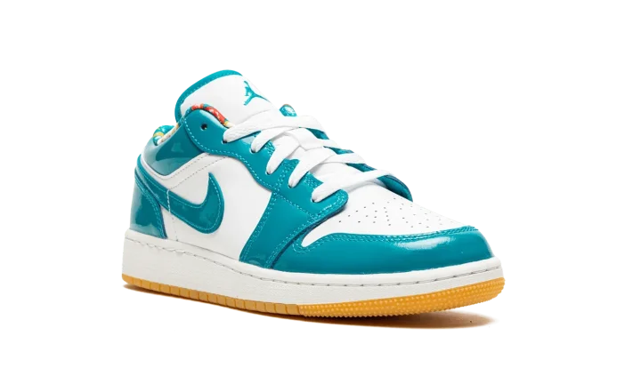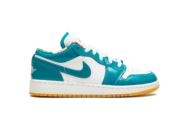The Air Jordan 1 Low SE GS "Barcelona" is the youth sizing of Michael Jordan's first signature shoe in a colorway that nods to a sweater that Jordan wore during the '92 Summer Olympics in Barcelona. A creative look for the popular low-top shoe, the "Barcelona" is dressed in a two-tone, white and Cyber Teal upper with white leather on the perforated toe and mid-panel. The overlays and Swoosh appear in glossy Cyber Teal-colored leather for a distinctive, '90s-esque look. White "Wings" branding is embroidered on the heel and a Cyber Teal Jumpman can be found on the white nylon tongue. The inner lining of both the left and right shoe feature a "Barcelona" inspired motif similar to the abstract tribal pattern found on the apparel that Jordan wore at the 1992 Olympics.