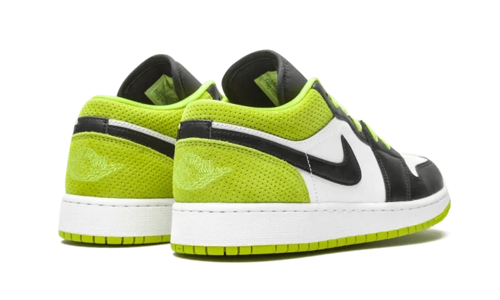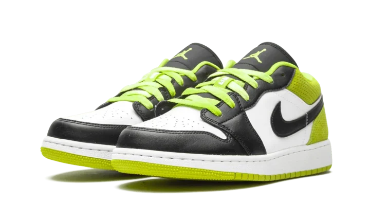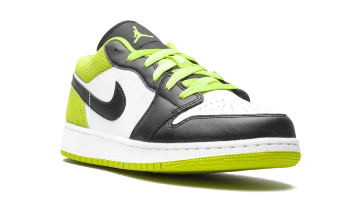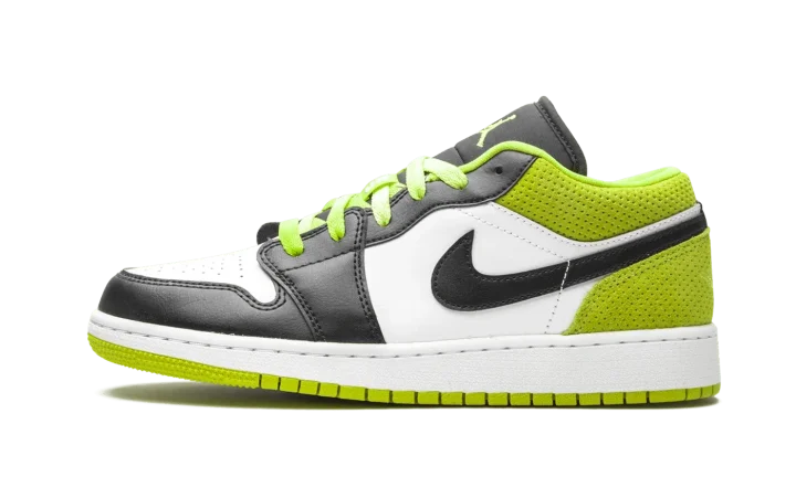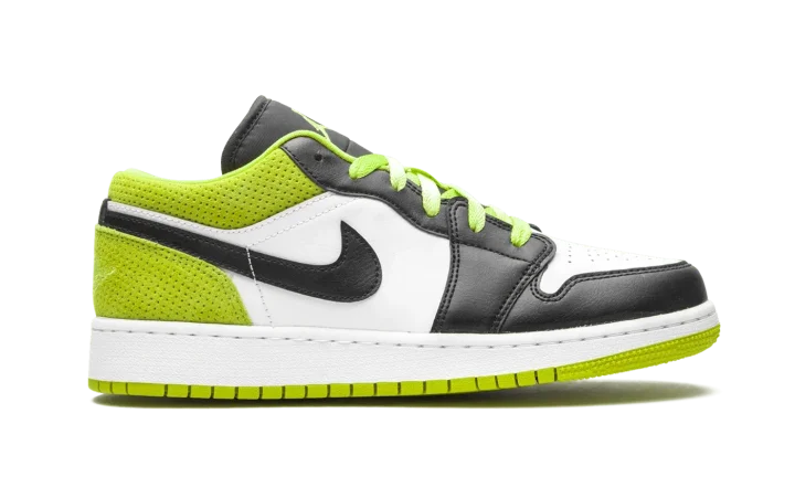The Air Jordan 1 Low SE GS "Black/Cyber" is the youth sizing of Michael Jordan's iconic first signature shoe in a bold colorway for kids. Appearing on the Jordan 1 Low, the "Black/Cyber" features a mixture of colors and materials for a unique appearance. Black leather overlays can be found on the forefoot, eyelets, and toe cap. Contrasting white leather appears on the perforated toe and mid-panel. A black leather Swoosh is located on either side of the shoe. A dotted Cyber or lime green suede material can be found on the back of the design on the collar and heel. A tonal embroidered "Wings" emblem is stitched onto the heel for a classic Jordan 1 Low vibe. The same hue of green is used again on the laces and embroidered Jumpman branding on the black nylon tongue.