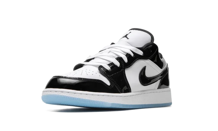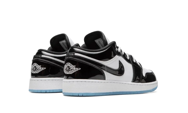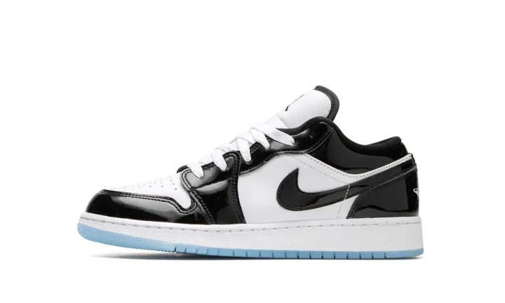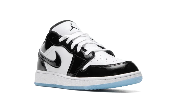 The Air Jordan 1 Low SE GS "Concord" is the youth sizing of the popular low-top sneaker that draws inspiration from the Air Jordan 11's original colorway. Based on the iconic "Concord" Jordan 11, the Jordan 1 Low SE GS features a white leather base with contrasting black patent leather overlays and Swoosh branding. White "Wings" detailing is embroidered on the back of the shoe. A black Jumpman is found on the white nylon tongue. Underfoot, the icy blue translucent outsole is a nod to the design of the Jordan 11's "Concord" colorway.
