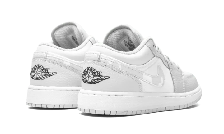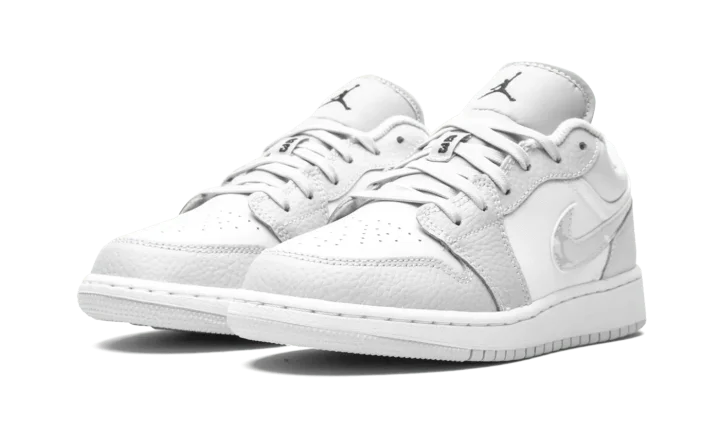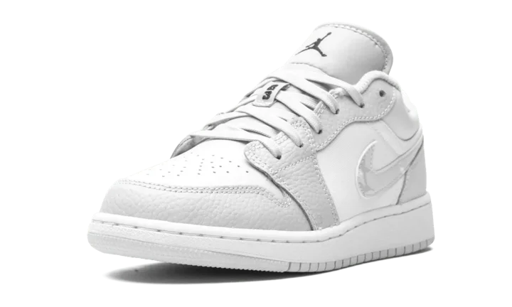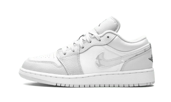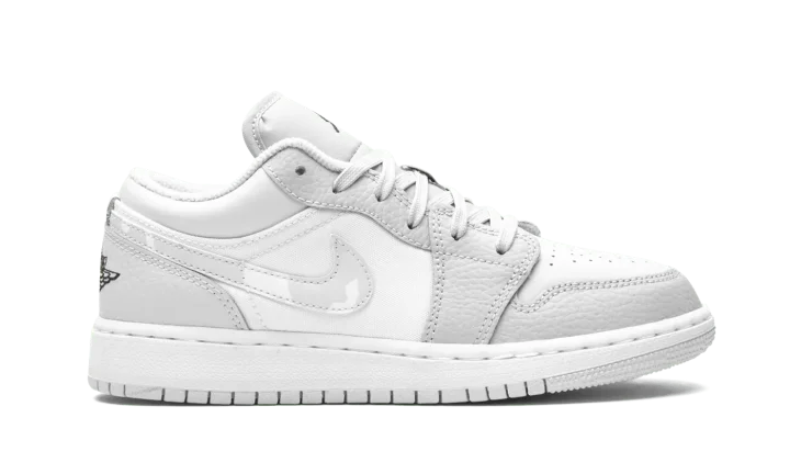 The Air Jordan 1 Low SE GS "Grey Camo Swoosh" adds yet another clean design of Michael Jordan's first signature shoe for kids in the popular low-top silhouette. Keeping a simple aesthetic, the "Grey Camo Swoosh" features buttery light grey tumbled leather overlays on the forefoot, eyelets, and heel. The look is contrasted by white mesh on the mid-panel and perforated toe. An ambiguous grey camo pattern inside of the Swoosh branding on either side balances the neutral based design. Final details include a black embroidered "Wings" logo on the heel, a black Jumpman on the nylon tongue, and black "23" branding on the lace overlay.