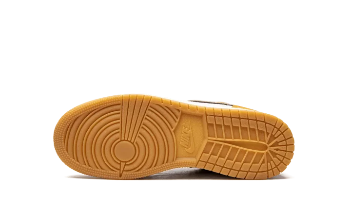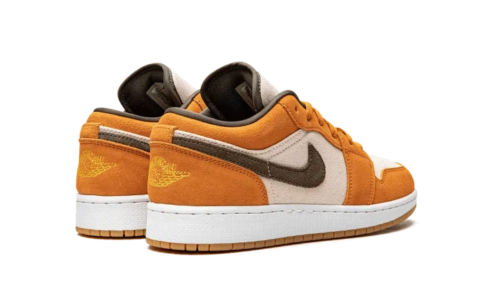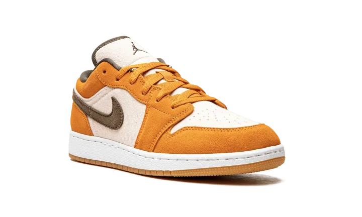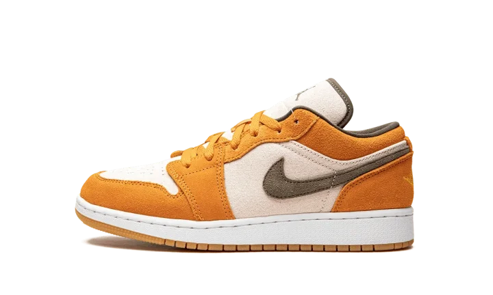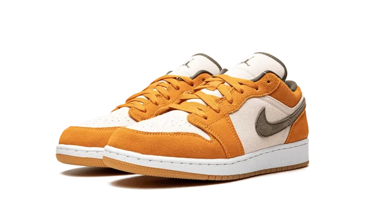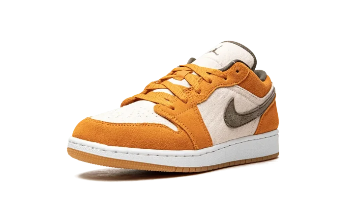 The Air Jordan 1 Low SE GS "Light Curry" is the youth sizing of the earth tone colorway of the Jordan 1's easy-wearing low-top silhouette. The "Light Curry" features Sail-colored canvas on the perforated toe and on the mid-panel. The overlay panels on the forefoot, eyelets, collar, and heel are designed in Light Curry suede. A Medium Olive canvas Swoosh appears on the sides and a yellow "Wings" logo is embroidered onto the heel. Jordan Brand places a Medium Olive-colored Jumpman logo on the Sail canvas tongue. Additional olive green accenting resides around the tongue and on the interior lining.