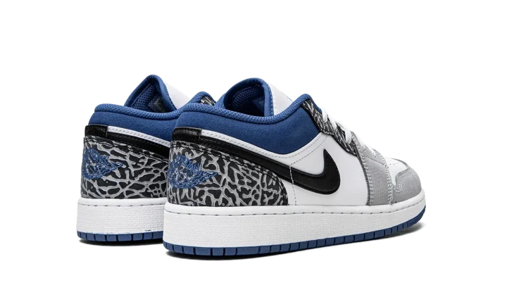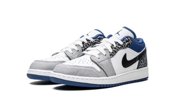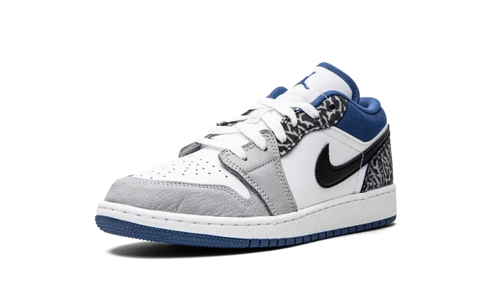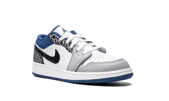 The Air Jordan 1 Low SE GS "True Blue" is the grade school children's sizing of the colorway of Michael Jordan's first signature shoe that pays homage to the original Air Jordan 3 of the same name. The "True Blue" Jordan 1 Low SE features design elements and colors lifted from the Jordan 3 "True Blue" that was originally released in 1988. The perforated toe and mid-panel are designed in white leather. Contrasting light grey leather appears on the toe cap and forefoot. Classic elephant patterning is found on the upper eyelet panel and on the heel with blue "Wings" embroidery. A black leather Swoosh resides on the sides. A Dark Marina Blue Jumpman logo appears on the white leather tongue. Additional blue accenting comes into play on the suede collar and on the underside of the tongue. Release date: June 11, 2022