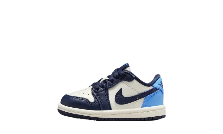 The Air Jordan 1 Low TD "Obisidian" is the toddler version of the 2025 lowtop. The little kids' AJ1 Low OG "Obisidian" has a leather upper that combines shades of navy and light blue with off-white. The lowtop Jordan 1 has a Wings logo on the heel and a navy Swoosh.