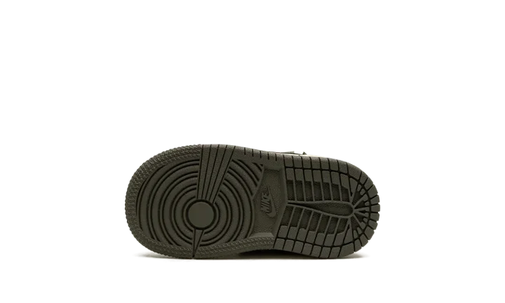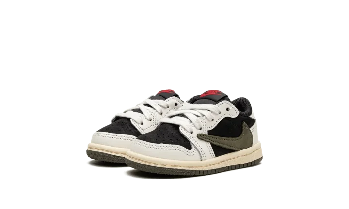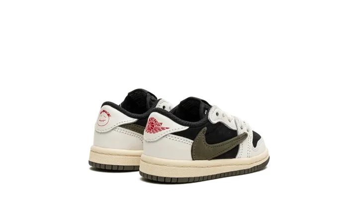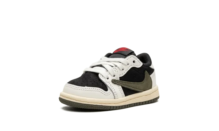 Give your little one a cool and stylish look with the Travis Scott x Air Jordan 1 Low "Olive" TD. This collaboration brings the popular design to tiny feet, perfect for your little trendsetter. The shoe features a black base with crisp white leather overlays, creating a striking contrast. An oversized, inverted Olive leather Swoosh adds a unique design element. Classic red "Nike" and Swoosh branding are found on the tongue, while Scott's signature smiley face is embroidered on the left heel and a "Wings" logo is embroidered on the right heel. These toddler sneakers let your little one rock a sought-after style.
