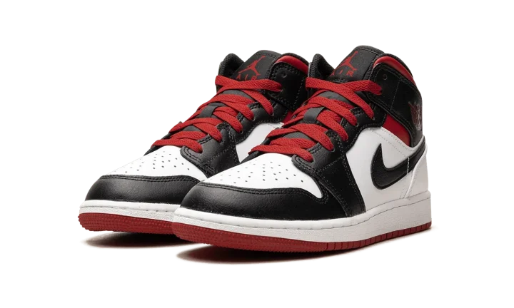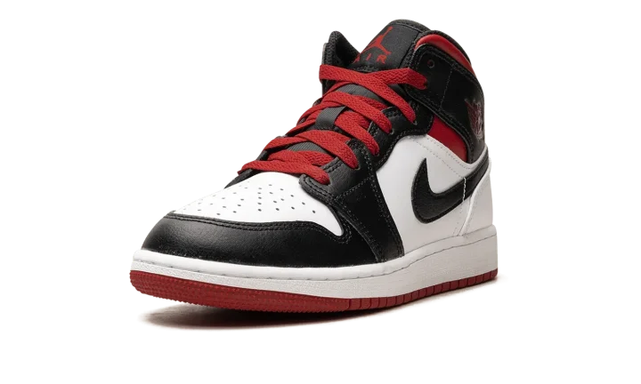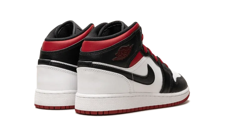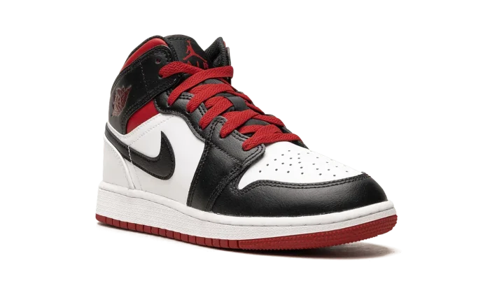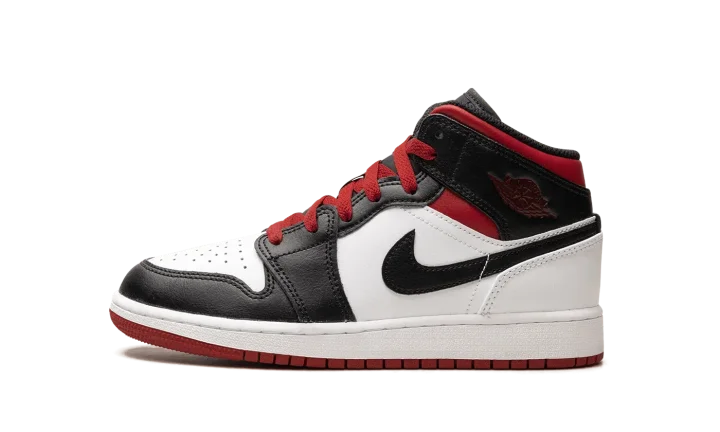 The Air Jordan 1 Mid GS "Gym Red Black Toe" is the youth sizing of the casual shoe in a decidedly Chicago Bulls-inspired colorway. Paying homage to Michael Jordan's run with the Bulls in the 1980s and 1990s, the "Gym Red Black Toe" features the team's uniform colors on its design. The upper features a white leather base with contrasting black leather on the toe cap, forefoot, eyelets, and collar. Gym Red accenting appears on the collar and laces, and on the "Wings" logo and Jumpman on the collar and tongue, respectively. A white midsole and red outsole complete the look. Release date: June 20, 2023