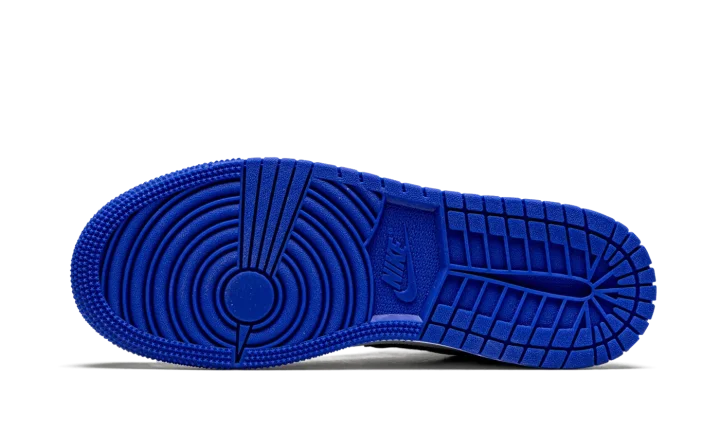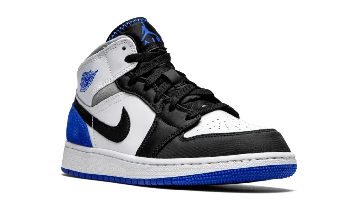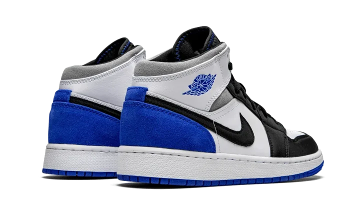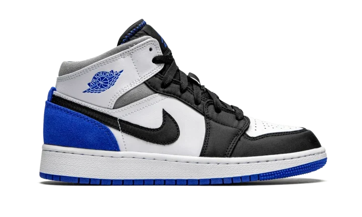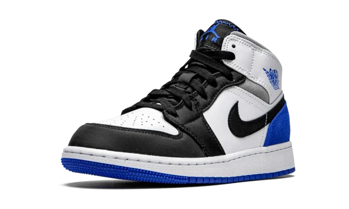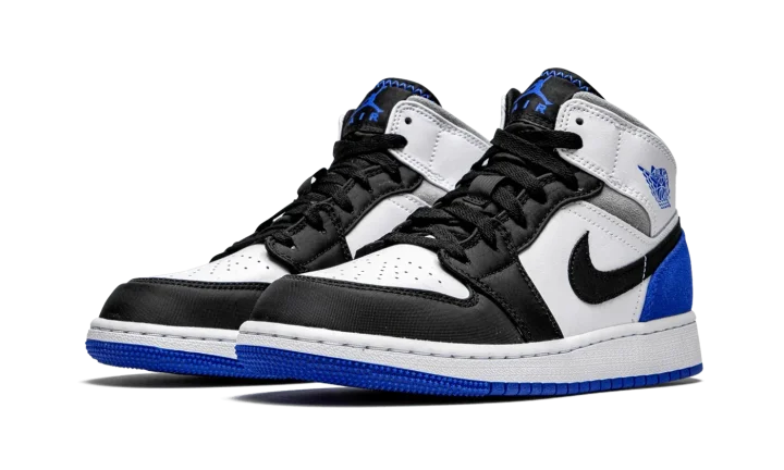 The Air Jordan 1 Mid GS "Royal/White" is another example of Michael Jordan's first signature shoe designed for kids in a fun colorway. This "Royal/White" look pulls inspiration from classic Jordan 1 designs for a new and unique appearance. Black tumbled leather detailing on the forefoot, toe cap, and eyelets stands out against the white perforated leather toe and smooth white leather mid-panel. Additional white leather appears on the collar overlay. A classic black leather Swoosh graces either side of the shoe. Additional branding, such as black "Wings" detailing on the collar, and white Jumpman on the tongue tab, give this shoe a timeless vibe. A Royal panel on the lower heel adds contrasting to the white rubber midsole.