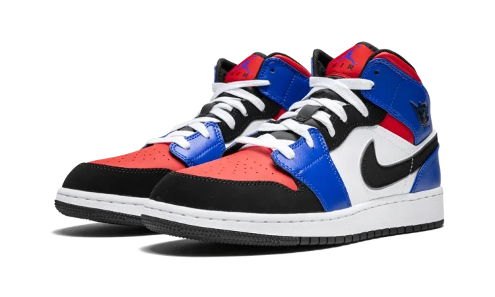 The Air Jordan 1 Mid GS "Top 3" is the kids' sizing for the colorway that creates an alternative take on the "Top 3" motif. Inspired by the Air Jordan 1 High with the same nickname, this Air Jordan 1 Mid features a combination of the original "Chicago," "Royal," and "Bred" colorways. This time, the color blocking is kept symmetric on each side of the shoe, differing from the "split" look of the initial "Top 3" design. In Grade School sizing for children, the Air Jordan 1 Mid "Top 3" from 2018 features a leather and synthetic nubuck construction.