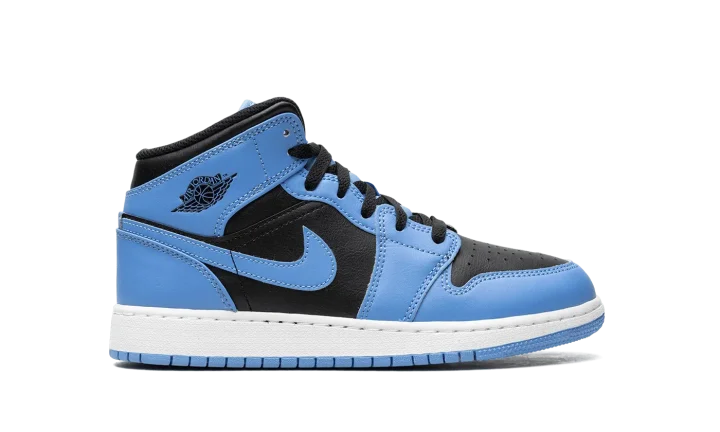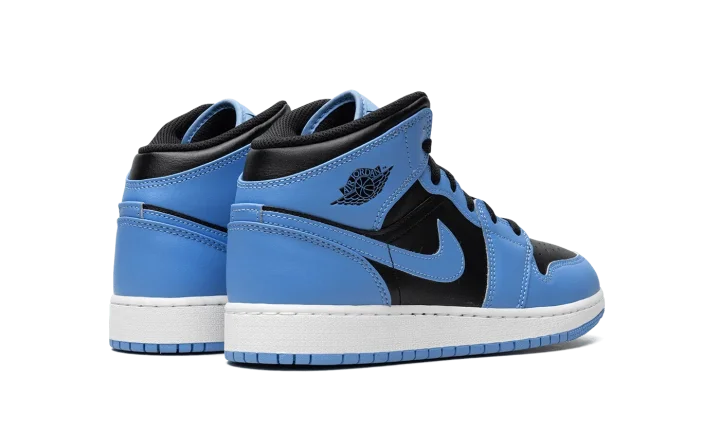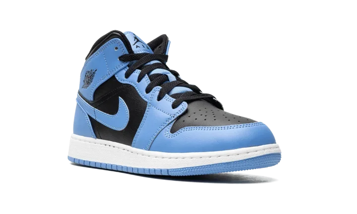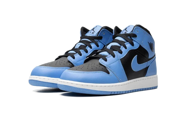 The Air Jordan 1 Mid GS "University Blue/Black" is the youth sizing of the colorway of the popular shoe with a mostly two-tone look. The "University Blue" theme is loosely inspired by Michael Jordan's alma mater, the University of North Carolina, as the light blue hue nods to the primary color found on the jerseys of the school's athletic teams. As for the design, the colorway features a black leather construction with University Blue leather overlays and Swoosh branding on the sides. A "Wings" logo appears on the collar and a Jumpman is seen on the tongue tag. The white rubber midsole and University Blue-colored rubber outsole complete the look. Release date: May 1, 2023